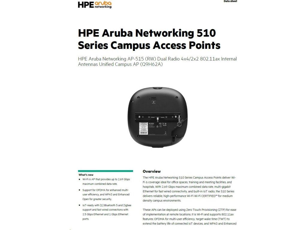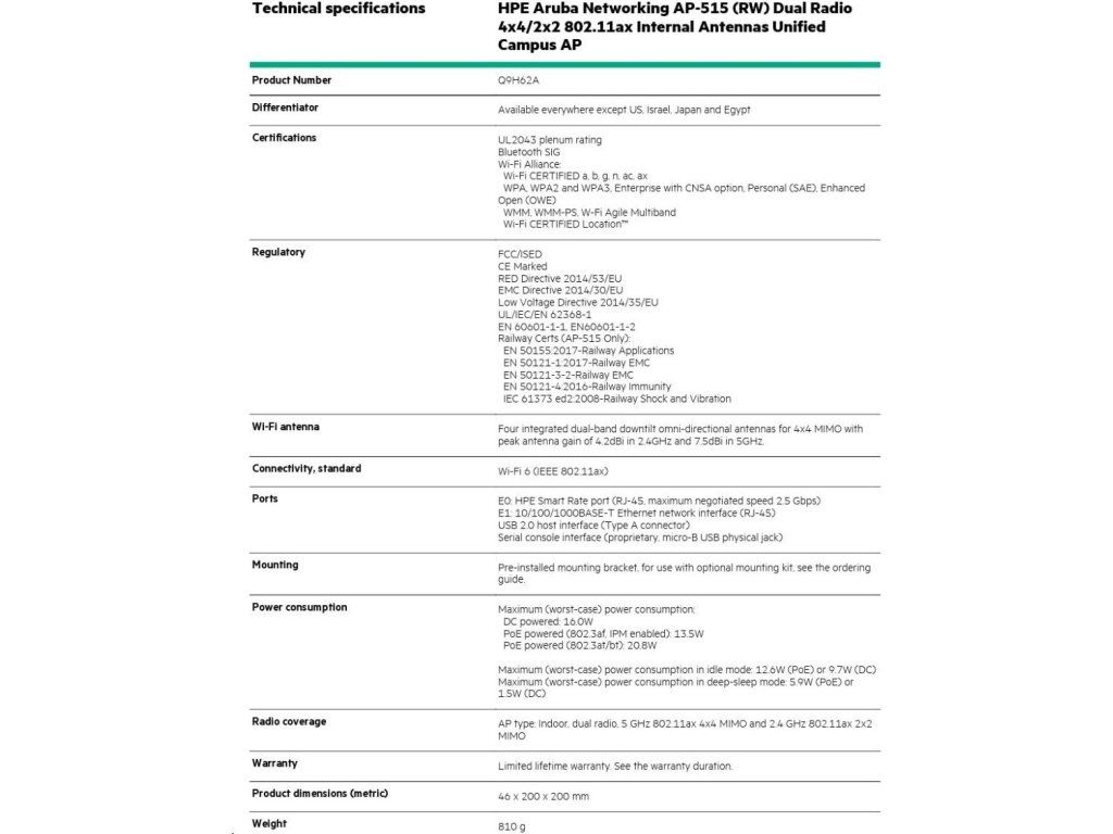 Aruba AP-515 (RW) Dual Radio 4x4:4 + 2x2:2 802.11ax Internal Antennas Unified Campus AP RENEW Q9H62A Q9H62AR