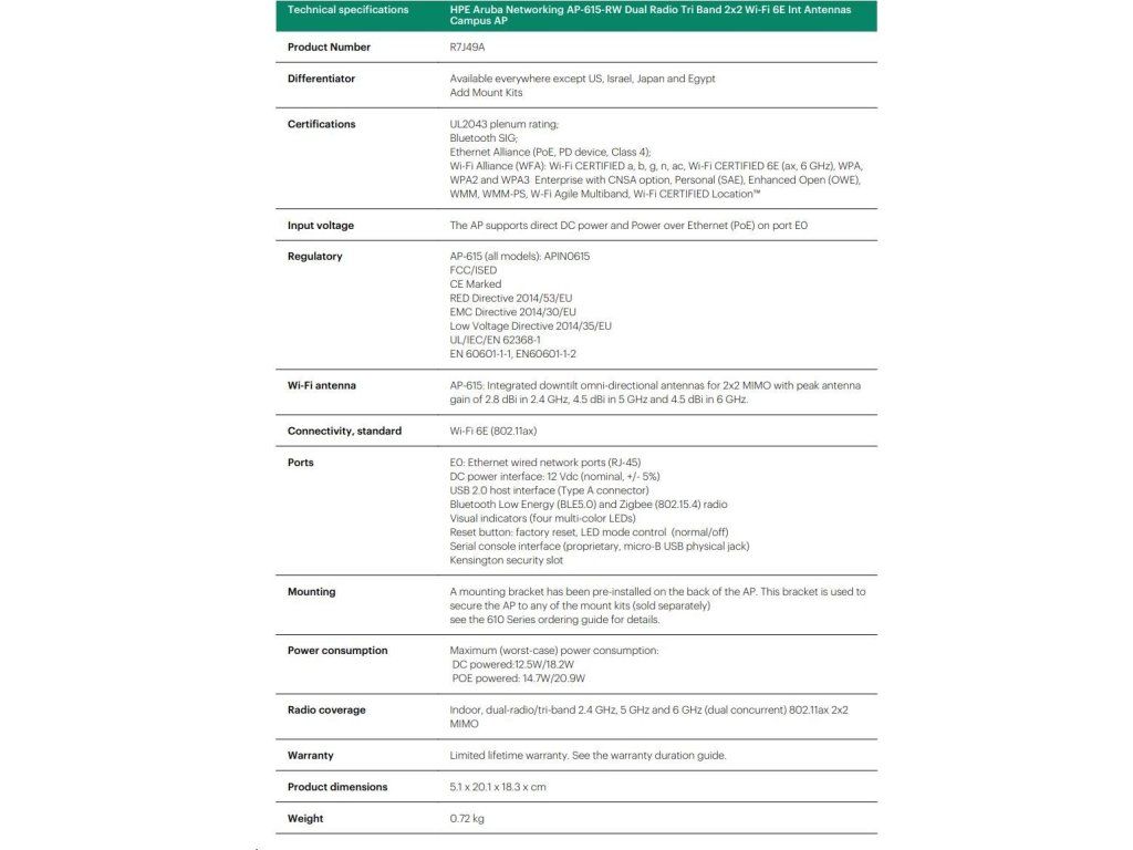 Aruba AP-615 (RW) Dual-radio Tri-band 2x2:2 802.11ax Wi-Fi 6E Internal Antennas Campus AP RENEW R7J49A