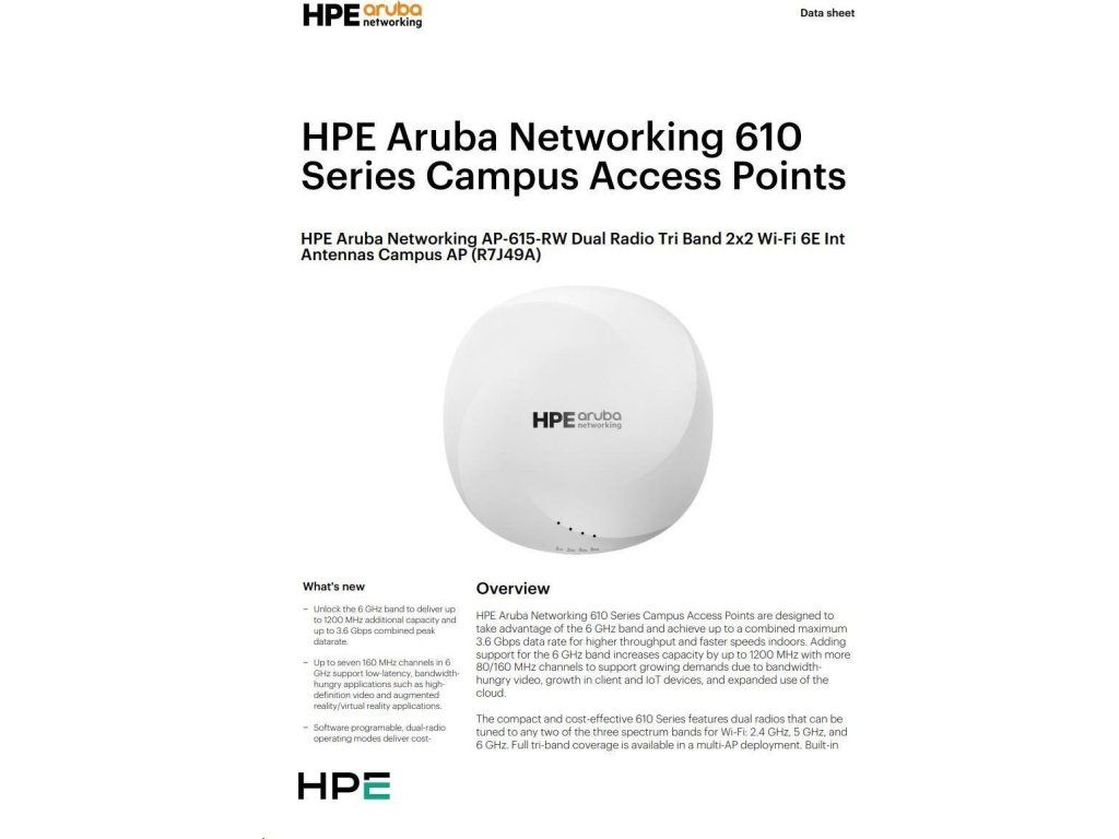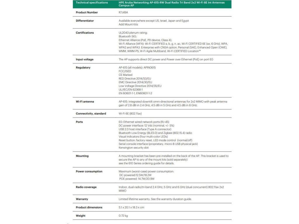 Aruba AP-615 (RW) Dual-radio Tri-band 2x2:2 802.11ax Wi-Fi 6E Internal Antennas Campus AP