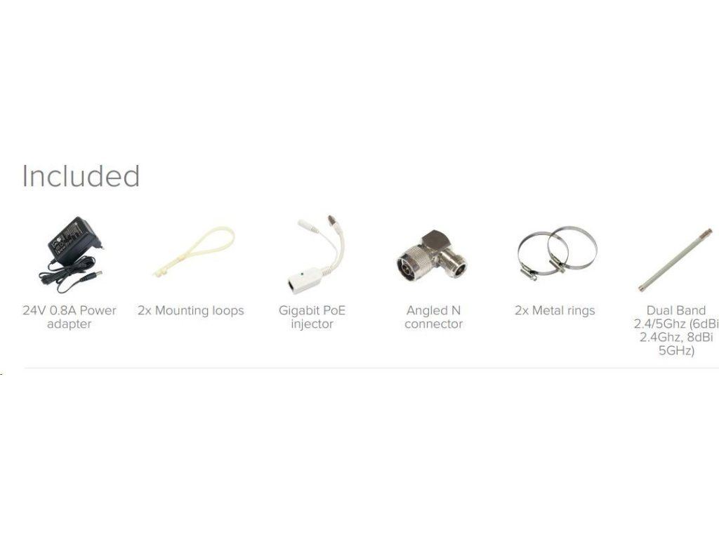 Balenie obsahuje: RouterBOARD GrooveA-52HPn, injektor PoE, napájací zdroj, montážnu sadu (o-krúžky), pravouhlý N-rozbočovač a všesmerovú anténu 6 dBi.