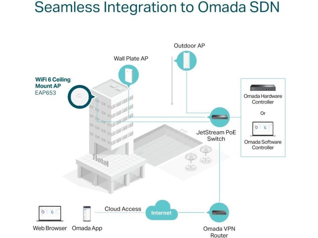 - Centralizovaná cloudová správa - vďaka integrácii do platformy Omada SDN môžete celú sieť spravovať lokálne alebo cez cloud prostredníctvom webového rozhrania alebo aplikácie Omada.