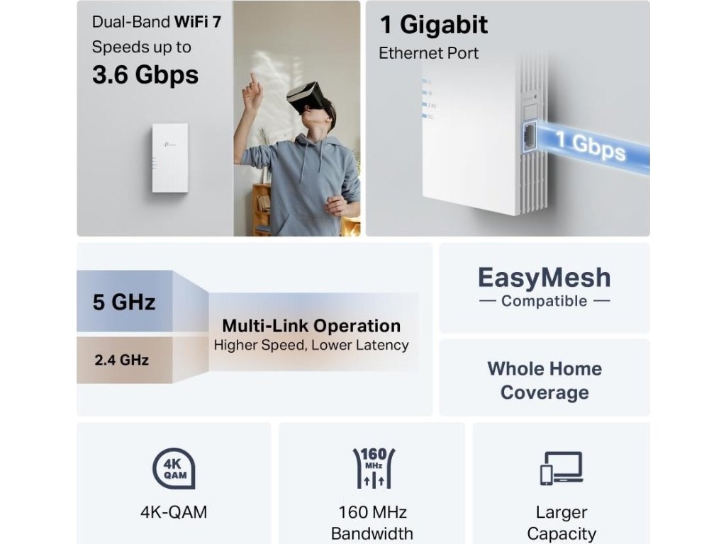 - 3,6 Gbps dvoupásmová Wi-Fi 7: Poskytuje rýchlosť až 3,6 Gbps (2882 Mbps na 5 GHz a 688 Mbps na 2,4 GHz)†, čo zabezpečuje stabilný výkon pre každodenné streamovanie, prehliadanie a multitasking.