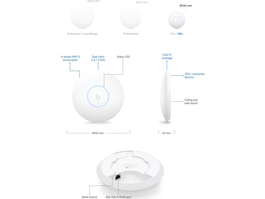 UniFi 6+ Access Point je základní Dual Band WiFi 6 AP (2.4GHz a 5GHz) do menších hal, skladů či kanceláří. U6+ je schopen dosáhnout skvělých propustností. V pásmu 5 GHz (2x2 MIMO) je to 2402 Mbps při použití 160 MHz šířkou pásma a ve 2.4 GHz (2x2 MIMO) je to 574 Mbps, což mu umožňuje podporovat více než 300 současně připojených klientů. Pro připojení do sítě má Access Point Gigabitový ethernet s podporou aktivního (802.3at) ale i pasivního (44 až 57V) PoE.