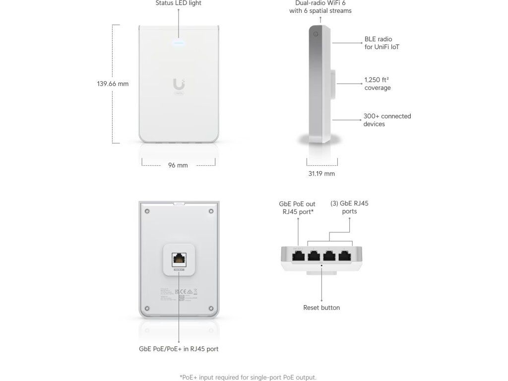 U6-IW je prístupový bod MU-MIMO WiFi 6 z rodiny UniFi, ktorý je určený na zabudovanie do dátovej skrinky v stene. Bezdrôtová časť je Dual Band, v pásme 5 GHz podporuje 4x4 MU-MIMO s maximálnou modulačnou rýchlosťou 4804Mbps a v pásme 2,4 GHz je to 2x2 MIMO s modulačnou rýchlosťou 574 Mbps. Napájanie je cez 802.3af/at alebo pasívne PoE 44 až 57V DC. V prípade použitia funkcie PoE passthrough je maximálny výkon na výstupnom porte 15,4W. Zariadenie je podporované UniFi Controller verzie 6.4.52 a novšej.