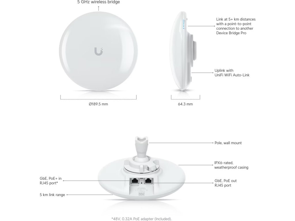 5 GHz wireless bridge with PoE output that connects at 5+ km distances or seamlessly uplinks to UniFi WiFi.