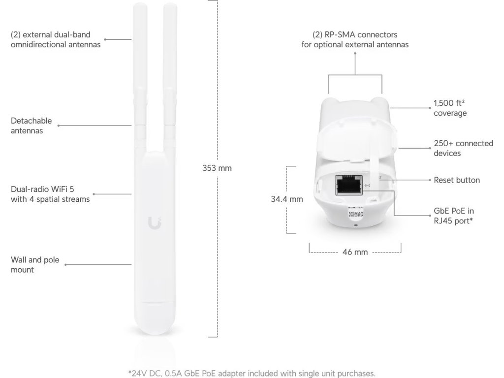 uniFi AP AC Mesh je vonkajší vodotesný sieťový prístupový bod s celkovou priepustnosťou až 1167 Mb/s (2.4GHz 300Mbps + 5GHz 867Mbps), má všesmerové dvojpásmové pripojenie 2x2MIMO. 3dBi (4dBi pre 5GHz) anténa s rádiovým výkonom 20dBm pre 2,4 aj 5GHz súčasne. Podporuje 802.11a/b/g/n/ac, má jeden gigabit.ethernet. prístav. Môže byť napájaný prostredníctvom aktívneho PoE podľa 802.3af alebo pasívne (24 V DC), PoE adaptér je súčasťou dodávky (pasívne). Maximálna spotreba energie je 8,5 W.