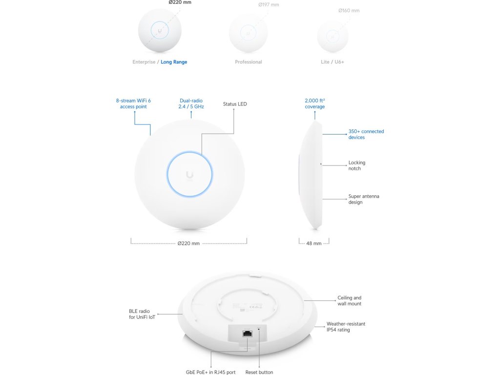 Dvojpásmové rádio s technológiou 4x4 MU-MIMO a OFDMA v pásme 5 GHz a 4x4 MIMO v pásme 2.4GHz, čím sa dosiahne súhrnná priepustnosť až do 3 Gb/s. Vďaka svojmu nenápadnému dizajnu sa hodí do každého prostredia a vďaka krytiu IP54 ho možno okrem vnútorných inštalácií používať čiastočne aj vo vonkajšom prostredí.