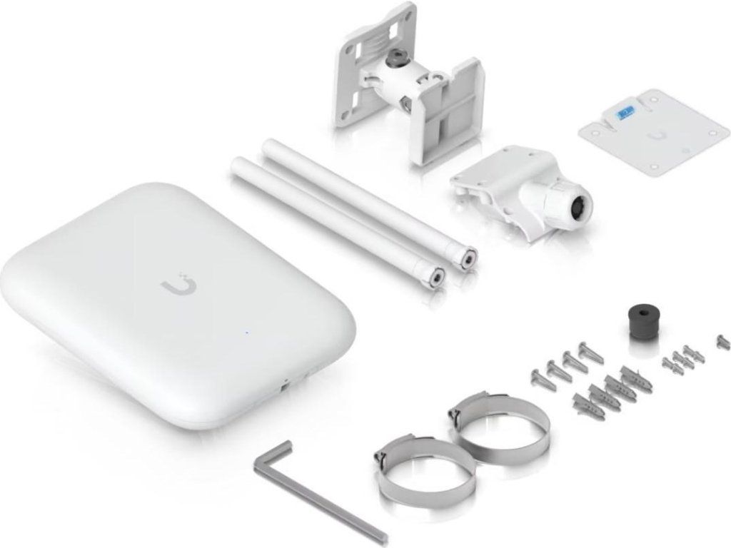 Ubiquiti U7 Pro Outdoor je nová venkovní tripple-band jednotka s podporou Wi-Fi 7. Pracuje v pásmu 2,4 GHz o rychlosti 688 Mb/s, v pásmu 5 GHz o rychlosti 4,3 Gb/s a v pásmu 6 GHz o rychlosti 5,7 Gb/s. Jednotka disponuje vestavěnou anténou se ziskem 8-10 dBi a vyzařovacím úhlem 90°, součástí balení jsou také dvě externí všesměrové antény, které připojíte pomocí RP-SMA konektorů na horní části. Pro připojení do sítě je k dispozici LAN port o rychlosti až 2,5 Gb/s. Access point je napájen pomocí PoE+ (adaptér není součástí balení).