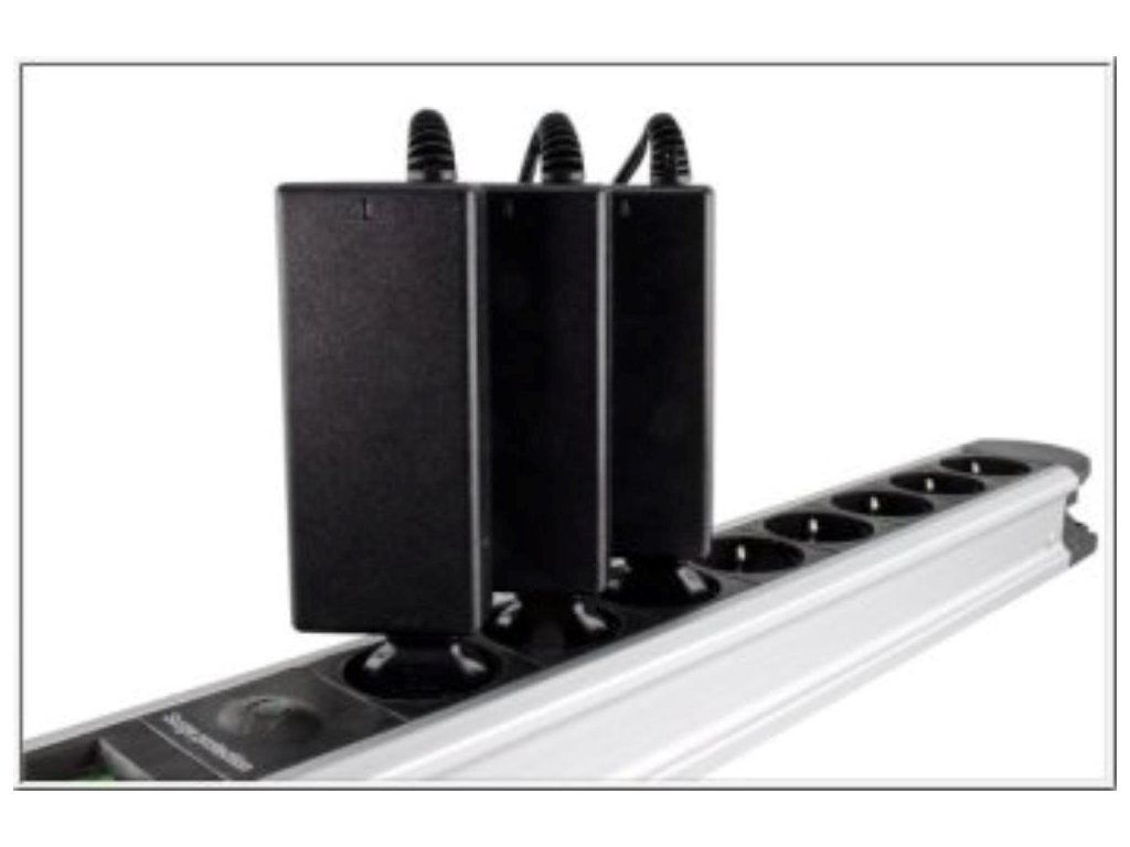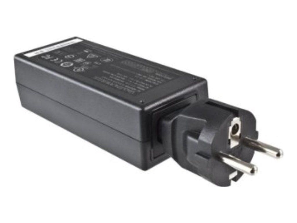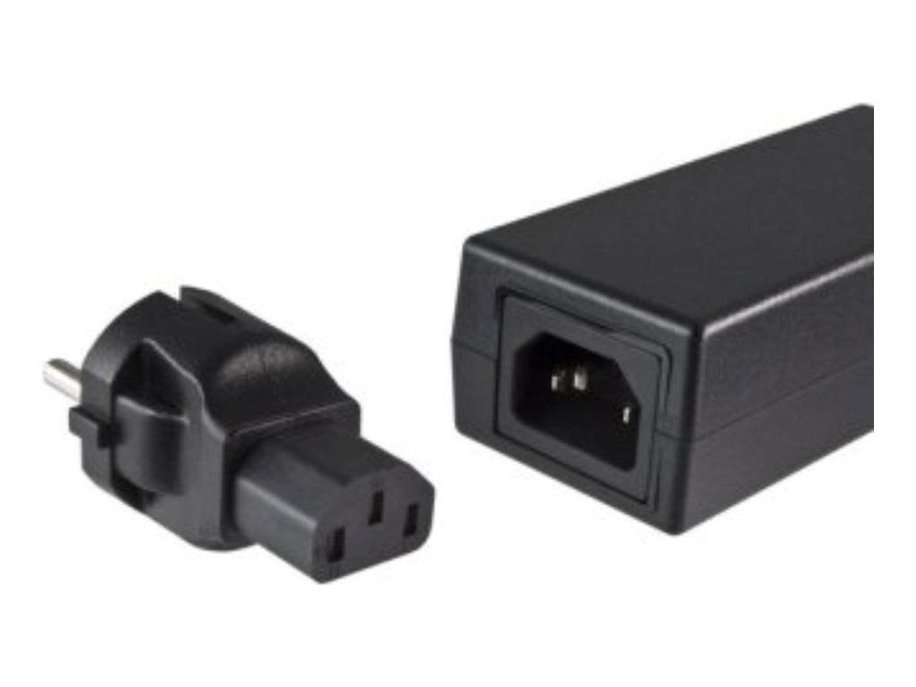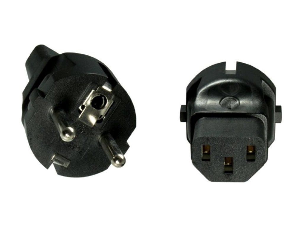 Napájací adaptér v čiernom prevedení, so vstupným konektorom CEE 7/7 a výstupným IEC C13. Výstupná zásuvka je rovná, nemeckého typu, s ochrannými plieškami po stranách, vhodná na pripojenie vidlice, ktorá je vybavená zemniacimi plieškami po stranách.