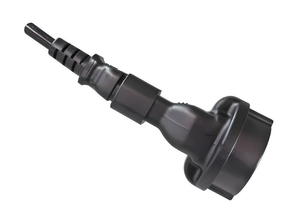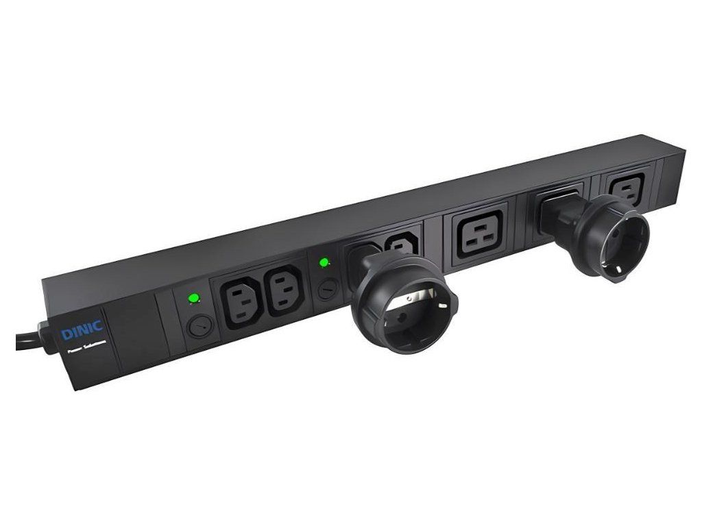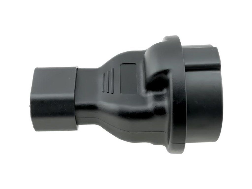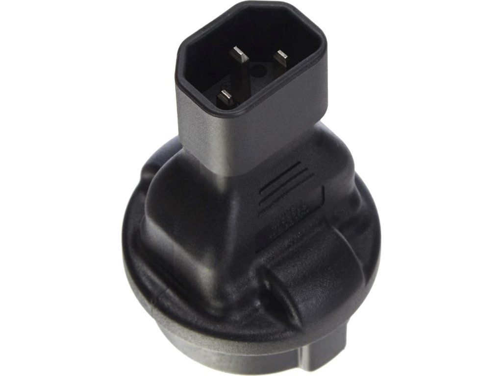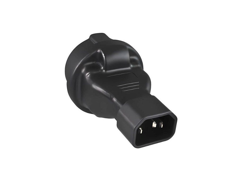 Napájací adaptér v čiernom prevedení pre UPC, s vstupným konektorom IEC C14 (max. 10 A) a výstupnou zásuvkou SCHUKO CEE 7/3 (max. 16 A). Výstupná zásuvka je rovná, nemeckého typu, s ochrannými náramkami po stranách, vhodná na pripojenie vidlíc vybavených zemniacimi náramkami. Je veľmi dôležité zabezpečiť, aby prúd odobraný zo zásuvky nikdy neprekročil 10 A, aby nedošlo k preťaženiu vstupného konektora C14.