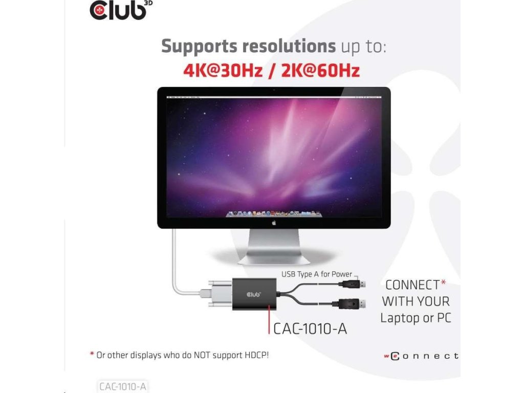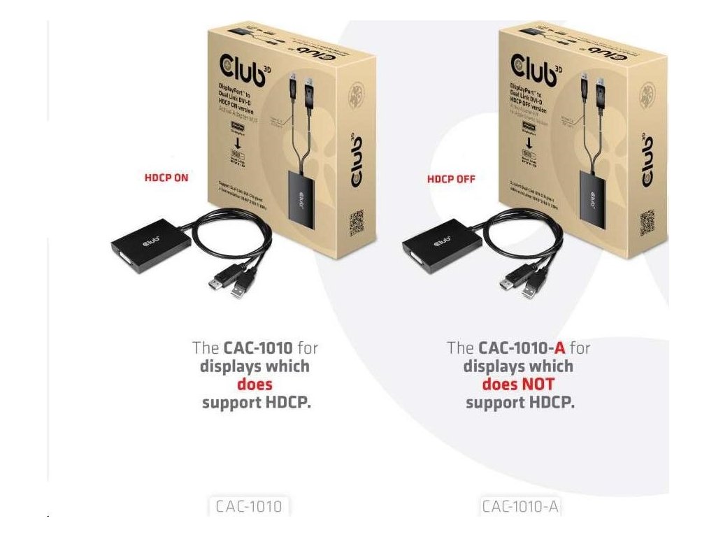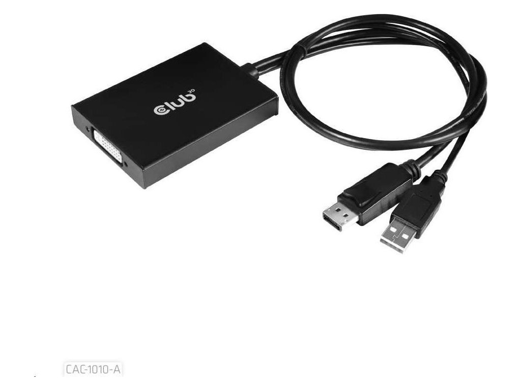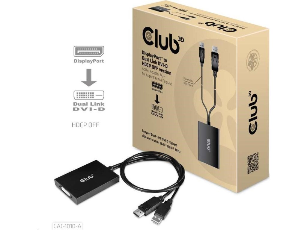 Aktívny adaptér Club 3D CAC-1010-A DisplayPort™ + USB typu A na Dual Link DVI-D HDCP verzia OFF pre Apple Cinema Displeje alebo iné displeje, ktoré nepodporujú HDCP, bez problémov konvertuje signál na pripojenie zdroja založeného na DisplayPort™ k bežným displejom DVI, ako sú CRT, LCD monitory a projektory, ktoré nepodporujú HDCP, môžete si vychutnať dokonalé širokouhlé plátno s rozlíšením 2560 × 1440 @ 60 Hz na akomkoľvek displeji podporujúcom HDCP. Ponúka riešenia pre digitálne zábavné centrá, prezentačné miestnosti, školy a firemné školenia.