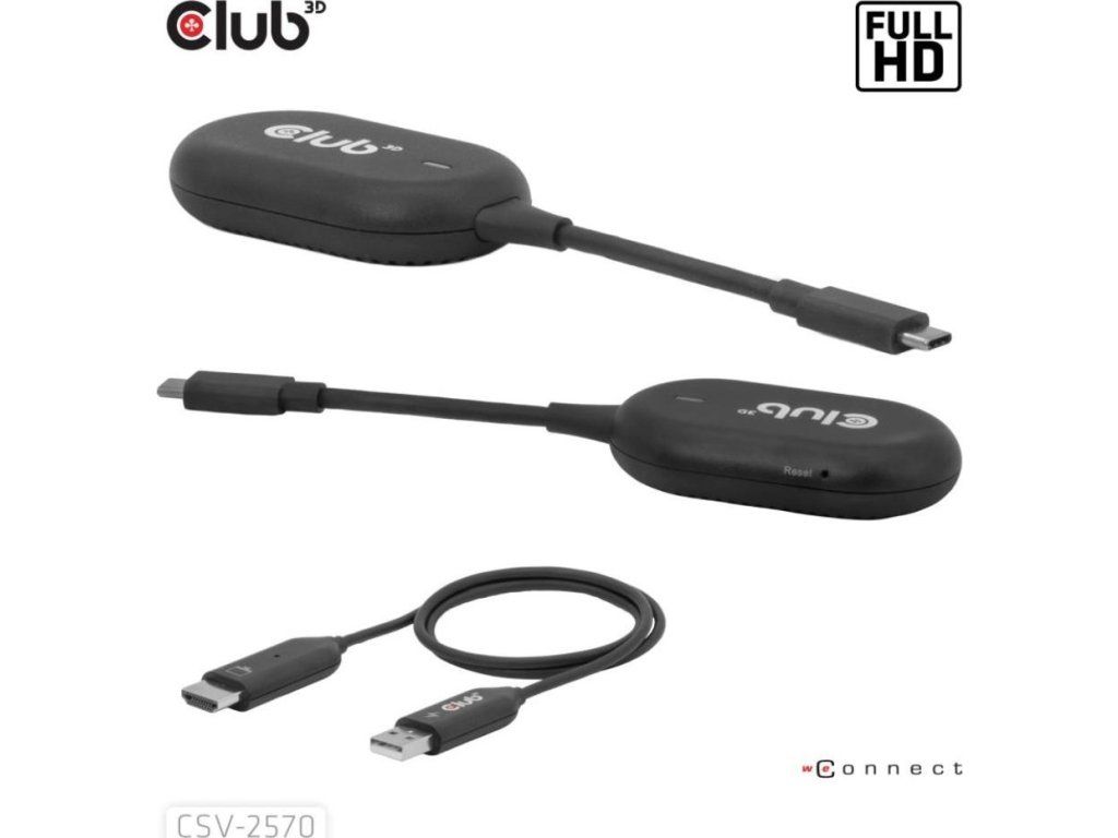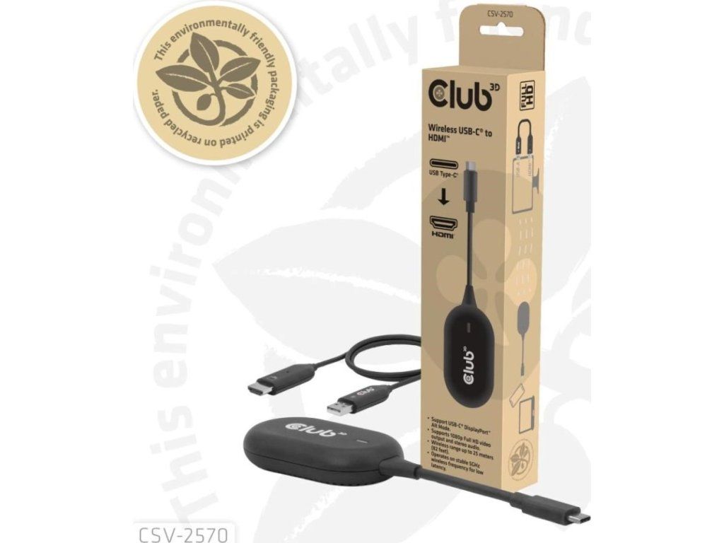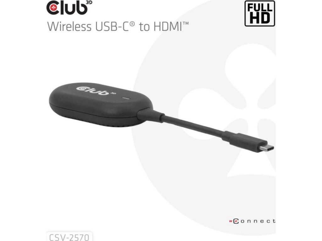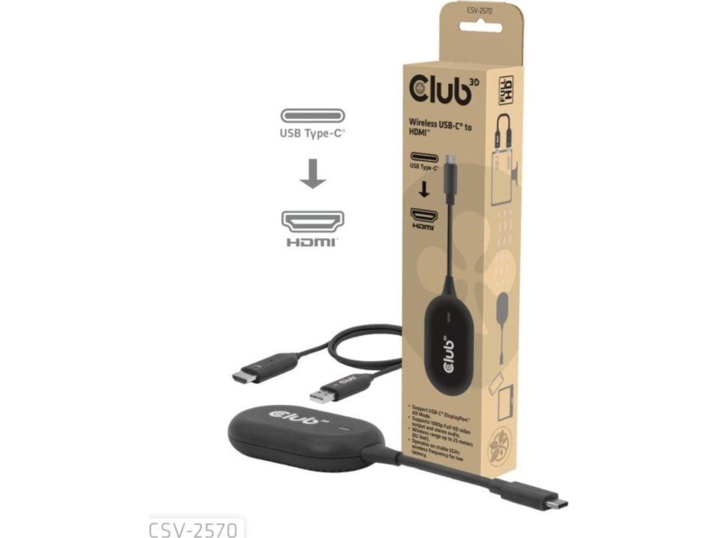 Club 3D CSV-2570 je prvé bezdrôtové zariadenie s technológiou HDMI. Pomocou vysielača a prijímača bezdrátovo prenáša video a zvuk vo FullHD kvalite z zariadenia s USB-C na HDMI displeje.