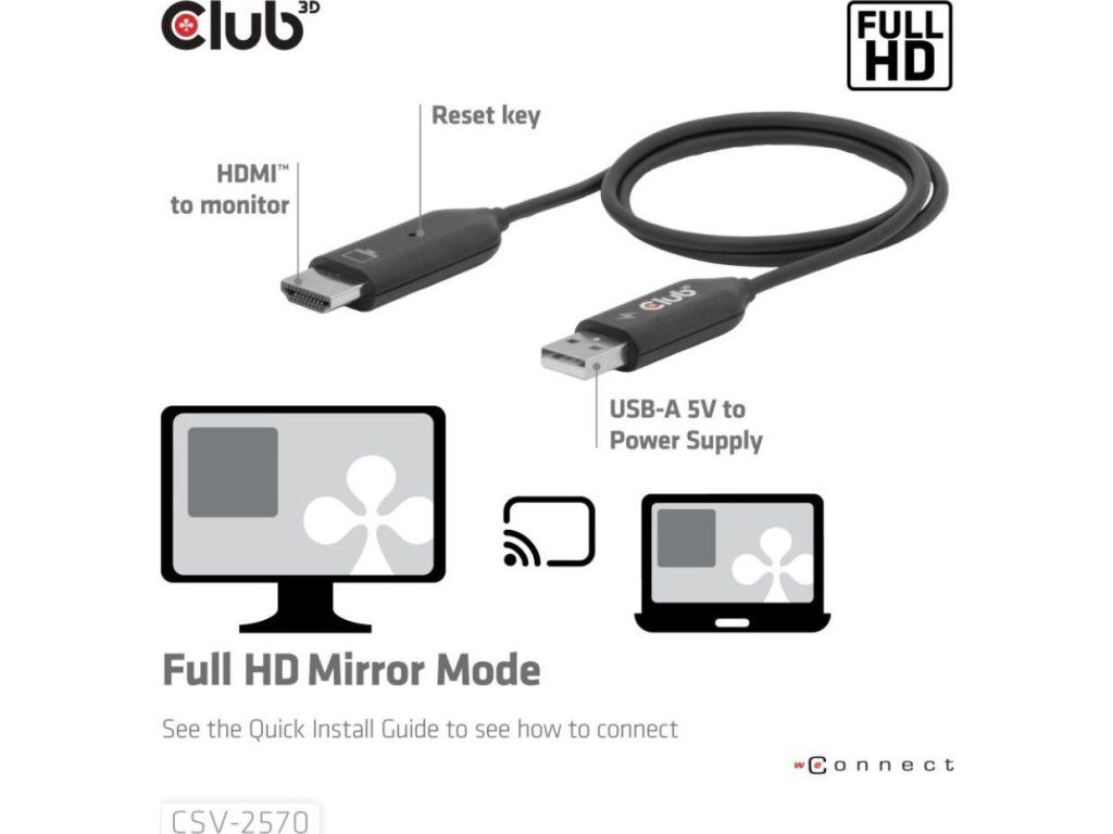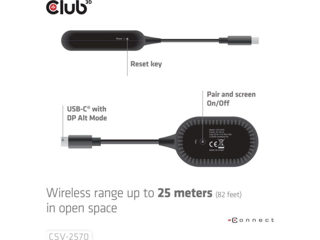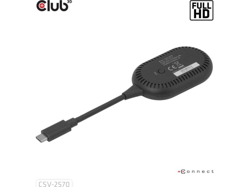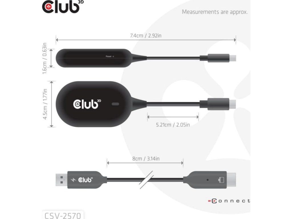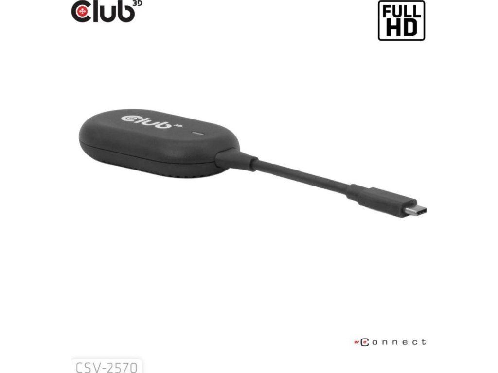 Club 3D CSV-2570 je prvé bezdrôtové zariadenie s technológiou HDMI. Pomocou vysielača a prijímača bezdrátovo prenáša video a zvuk vo FullHD kvalite z zariadenia s USB-C na HDMI displeje.