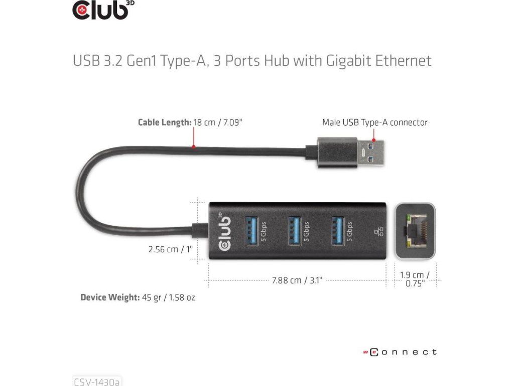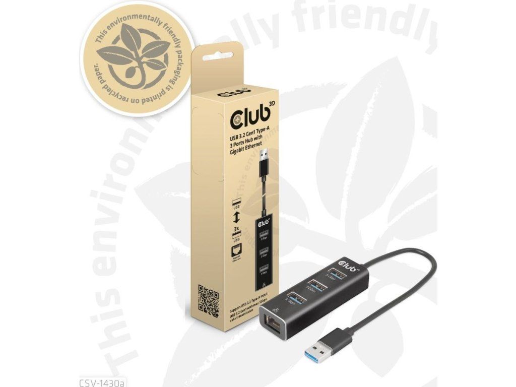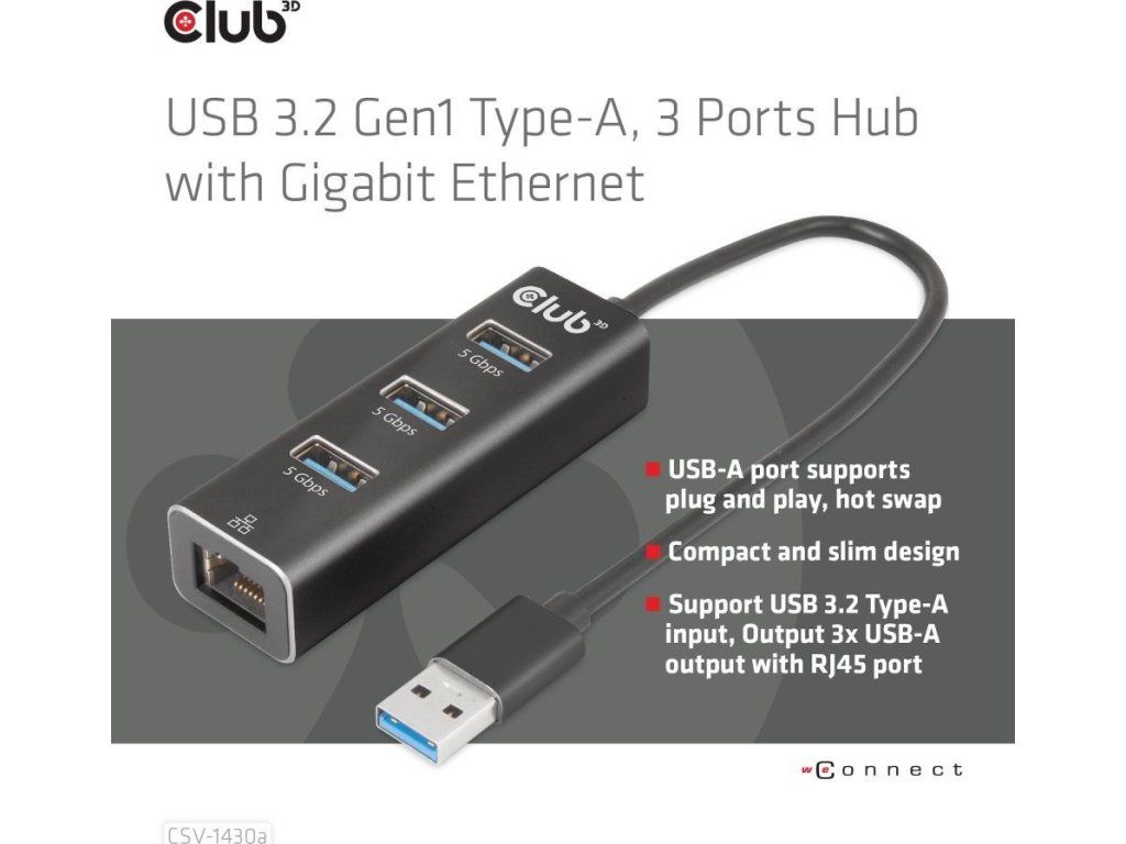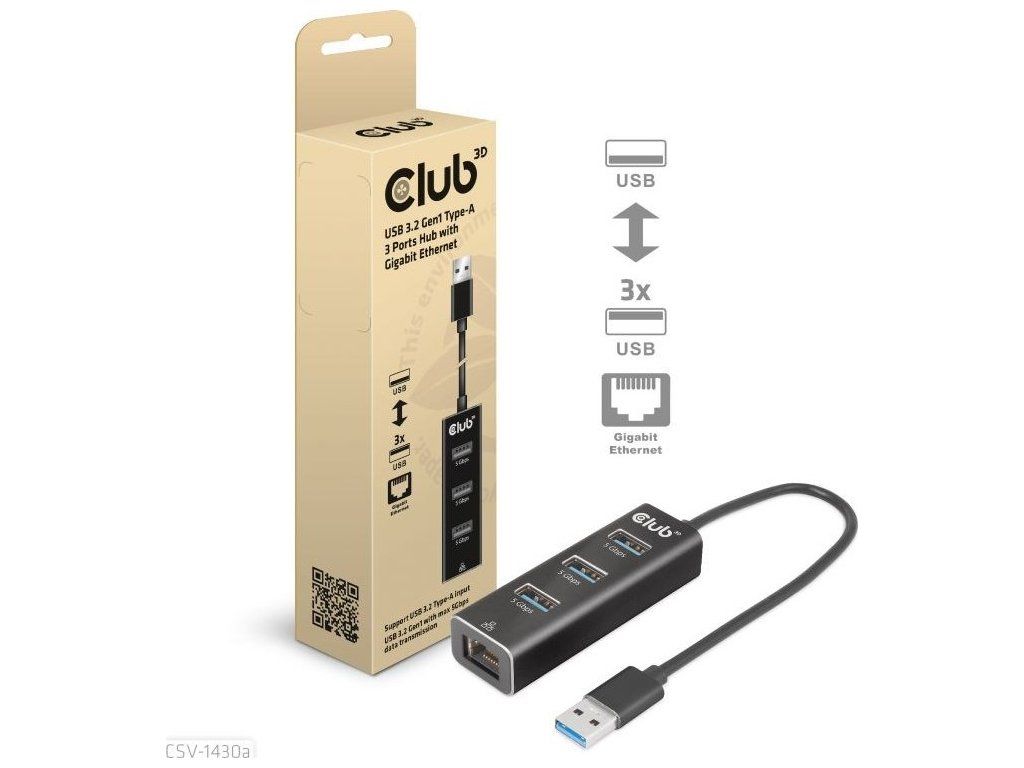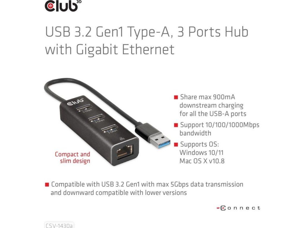 Club 3D CSV-1430a je rozbočovač USB 3.2 Gen1 Type-A so 3 portami s gigabitovým Ethernetom a je navrhnutý štýlovým spôsobom a veľmi tenký, takže sa ľahko prenáša. CSV-1430a vám umožňuje súčasný prístup k 3 portom USB 3.2 Gen1 Type-A a portu Ethernet 10/100/1000 z jediného up-linku USB 3.2 Gen1 Type-A. Zariadenie je spätne kompatibilné so štandardom USB 2.0, no to bude mať vplyv na výkon. Všetky 3 porty USB sú kompatibilné s USB Type-A a USB 3.2 Gen1 s prenosom dát max. 5 Gb/s. Ethernetový port je kompatibilný s Gigabit Ethernet 10/100/1000 (RJ45) a plne duplexný s riadením toku.
