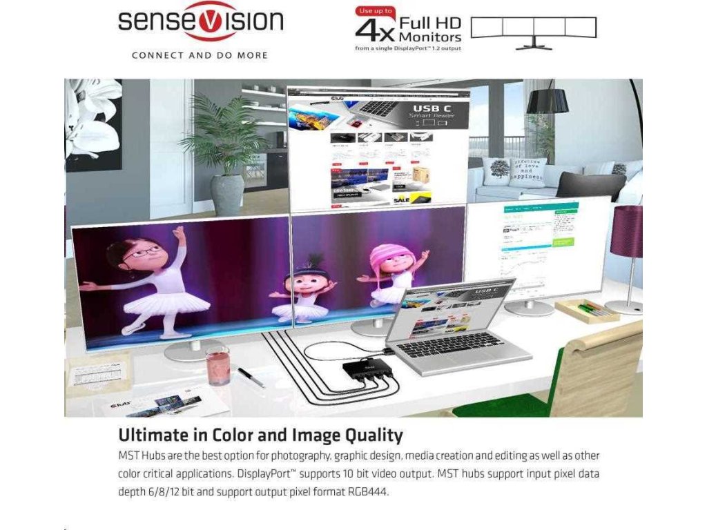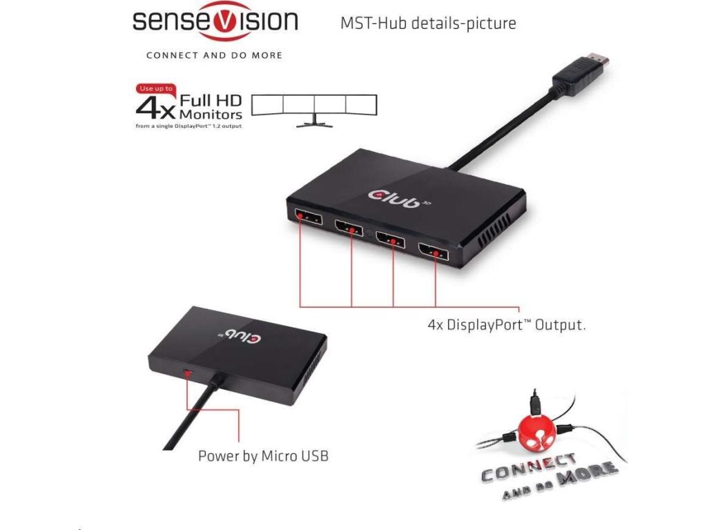Rozbočovače Club 3D SenseVision MST využívajú technológiu Multi Stream Transport, jedinečnú funkciu DisplayPort ™ 1.2, ktorá umožňuje prenášať viac nezávislých nekomprimovaných video (a audio) tokov na jedinom kábli To umožňuje použitie viacerých monitorov pripojených pomocou rozbočovača MST. Rozbočovače Club3D MST sú schopné distribuovať tieto video toky na pripojené obrazovky.