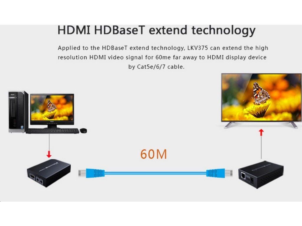 Zariadenie umožňuje prenášať signál HDMI 4K x 2K alebo FULL HD 1080p až na 70 m cez sieťový kábel.