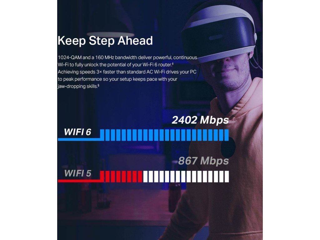 - Bezkonkurenčná rýchlosť Wi-Fi 6 – prekonáva gigabitovú hranicu rýchlosťou až 2402 Mb/s (5 GHz) + 574 Mb/s (2,4 GHz).