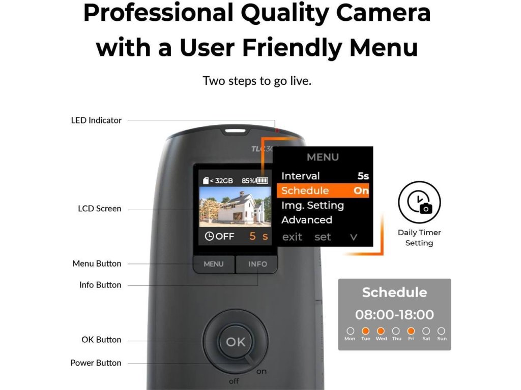 Jednoducho nastavte kameru v jasnom prostredí a skontrolujte uhol záberu bez oslnenia obrazovky vďaka krištáľovo čistému IPS LCD panelu TLC300. Novovyvinuté používateľské rozhranie Brinno poskytuje rýchlejšie nastavenie a používateľsky prívetivejšie natáčanie. Kamera BCC300 je dodávaná so všetkým, čo potrebujete na začiatok: odolným krytom IPX4, násteným držiakom a dvomi bungee šnúrkami.