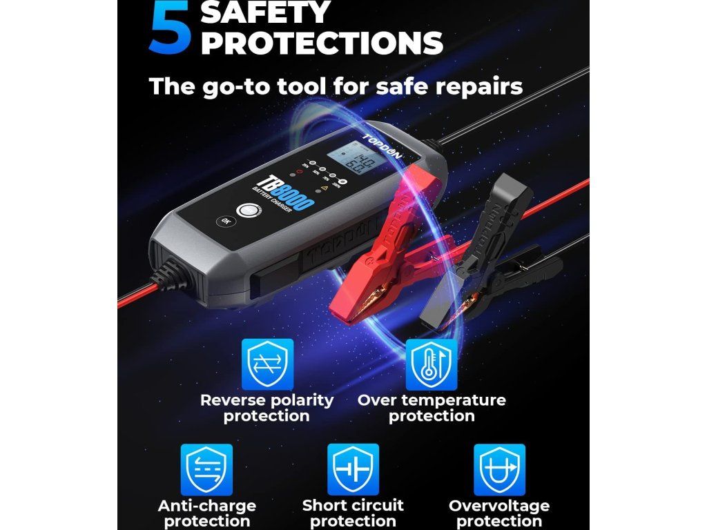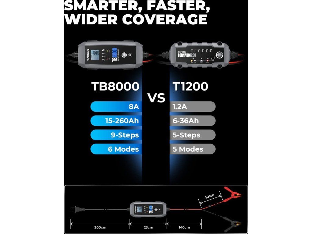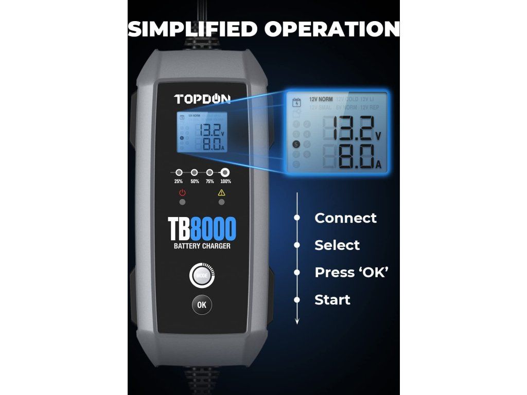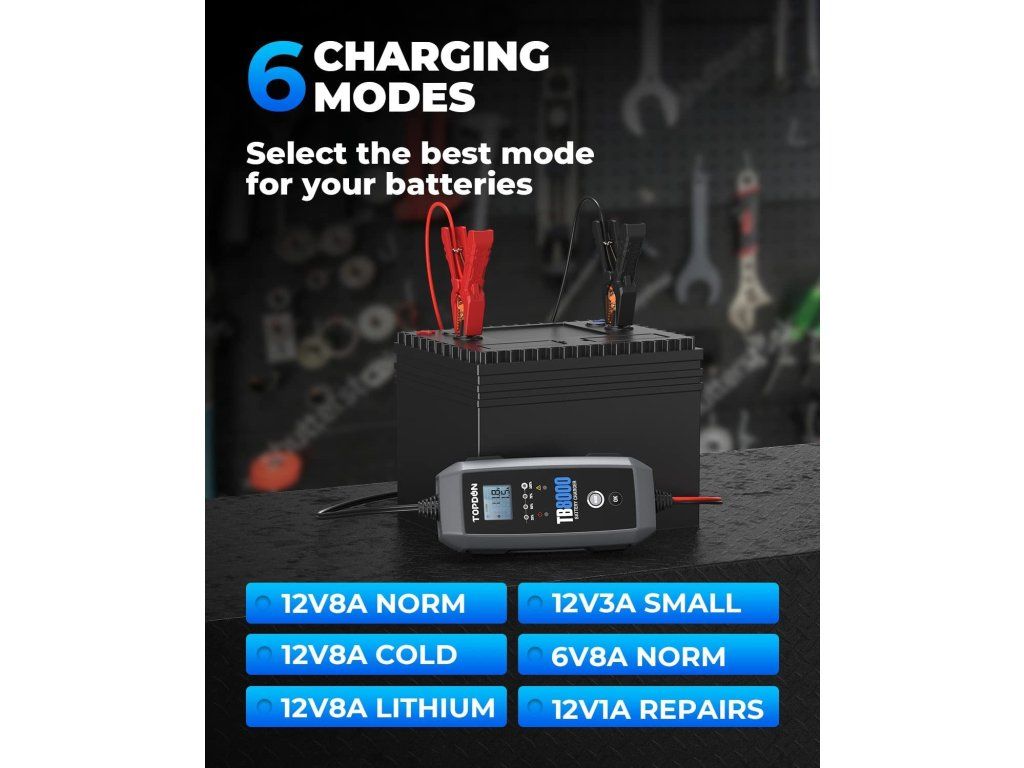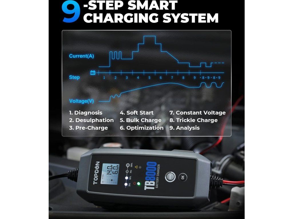 9stupňový systém inteligentného nabíjania TB8000 poskytuje používateľom špičkovú technológiu, ktorá automaticky identifikuje stav batérie a dodáva najvhodnejší prúd. S týmto zariadením sa už nemusíte obávať poškodenia batérií!