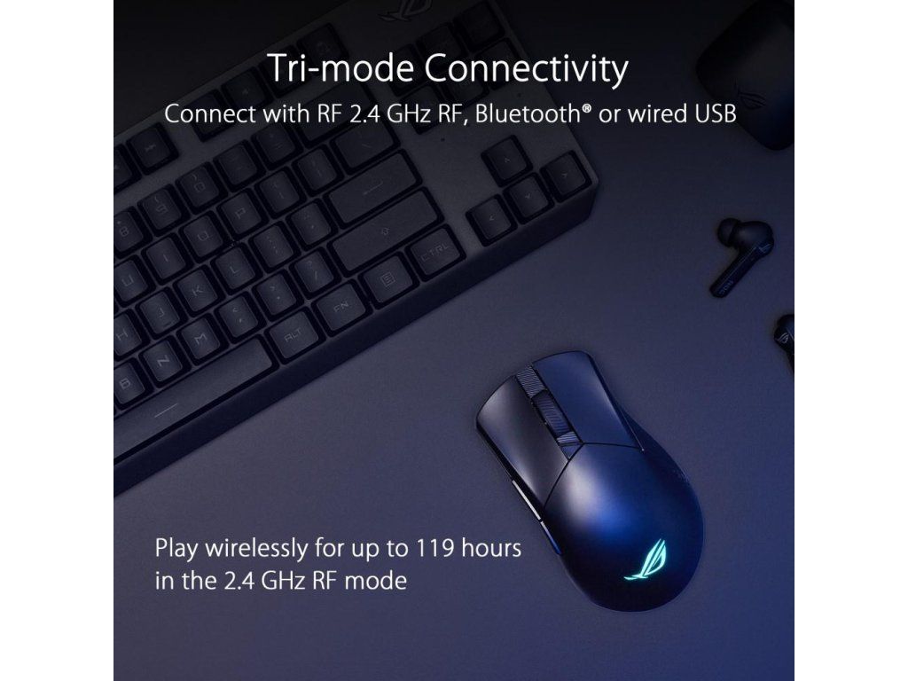 - Bezdrôtová technológia ROG SpeedNova: Poskytuje nízku latenciu, spoľahlivý bezdrôtový výkon a optimalizované riešenie napájania v režime 2,4 GHz RF.