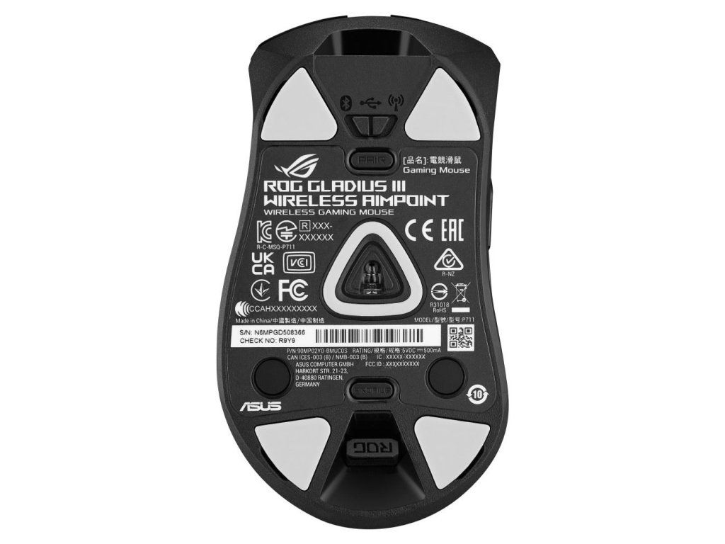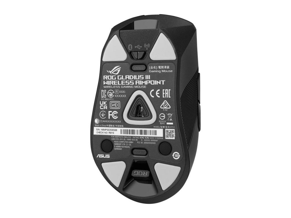 - Push-Fit Switch Socket II: Vymeniteľný dizajn spínača pre jednoduché prispôsobenie; Gladius III Wireless AimPoint obsahuje mikrospínače ROG a je kompatibilný s ďalšími 3pinovými mechanickými a 5pinovými optickými mikrospínačmi