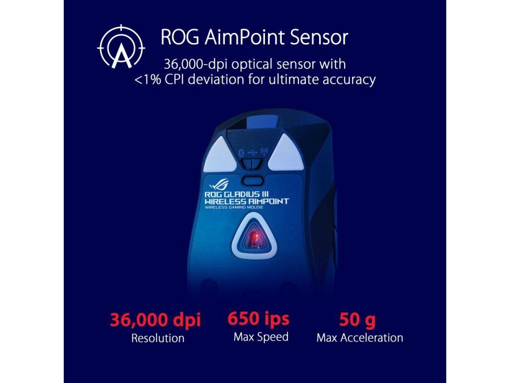 ROG Gladius III Wireless AimPoint je ľahká 79gramová bezdrôtová herná myš RGB, ktorá je vybavená optickým senzorom ROG AimPoint s rozlíšením 36 000 dpi, konektivitou v troch režimoch, bezdrôtovou technológiou ROG SpeedNova, vymeniteľnými spínačmi myši, mikrospínačmi ROG, mechanizmom otočných tlačidiel pre 0 Latency kliknutia ms, ergonomickým dizajnom, ROG Paracord, nožičkami myši zo 100% PTFE, šiestimi programovateľnými tlačidlami a páskou na uchopenie myši.