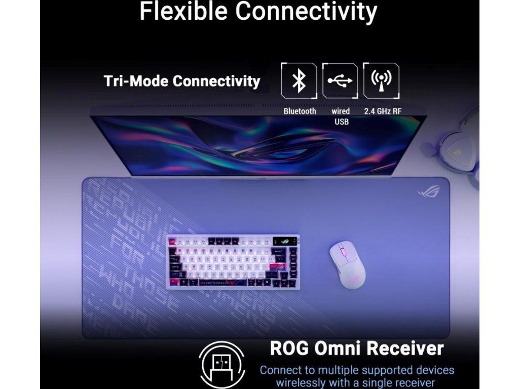 - Ultrarýchly bezdrôtový výkon: Všestranné možnosti pripojenia: 2,4GHz bezdrôtové RF, Bluetooth a káblové USB; pribalený prijímač ROG Omni podporuje bezdrôtové pripojenie viacerých zariadení pomocou jediného prijímača