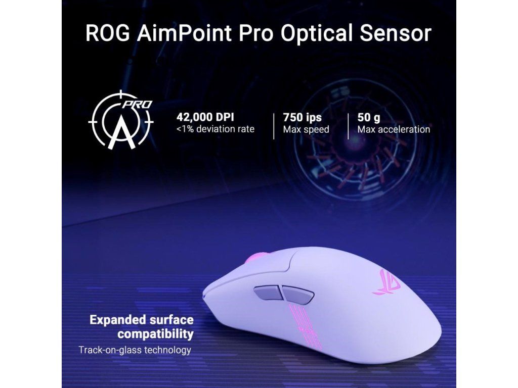 - Optický senzor ROG AimPoint Pro: Optický senzor s rozlíšením 42 000 dpi pre maximálnu presnosť, navyše s technológiou track-on-glass