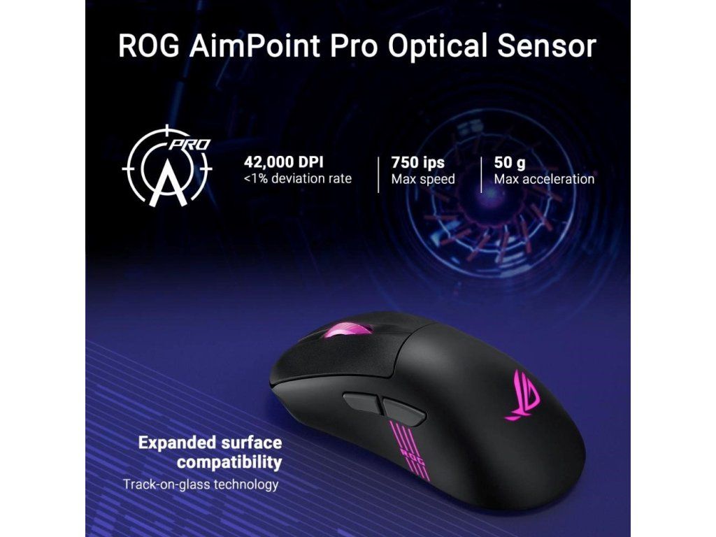 - Optický senzor ROG AimPoint Pro: Optický snímač s rozlíšením 42 000 dpi pre maximálnu presnosť, navyše s technológiou track-on-glass