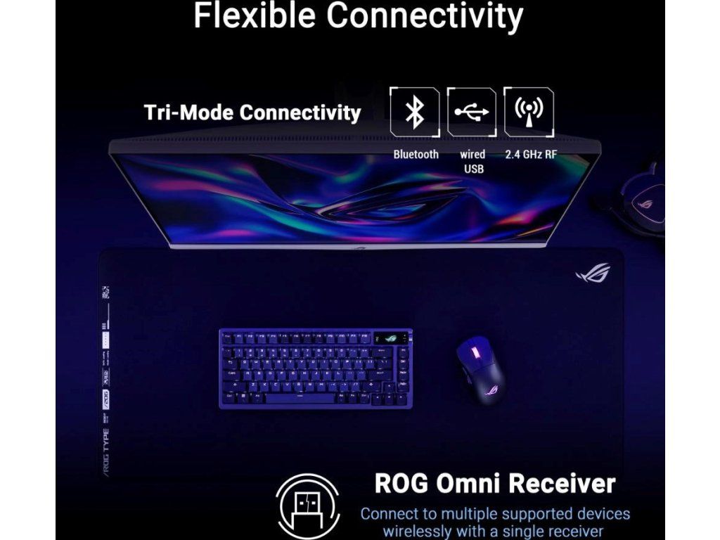 - Ultrarýchly bezdrôtový výkon: Všestranné možnosti pripojenia: 2,4GHz bezdrôtové RF, Bluetooth a káblové USB; pribalený prijímač ROG Omni podporuje bezdrôtové pripojenie viacerých zariadení pomocou jediného prijímača