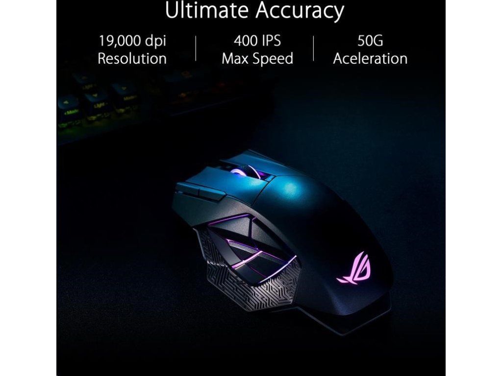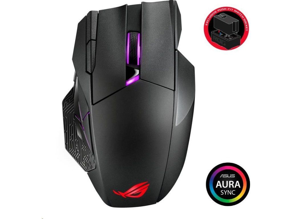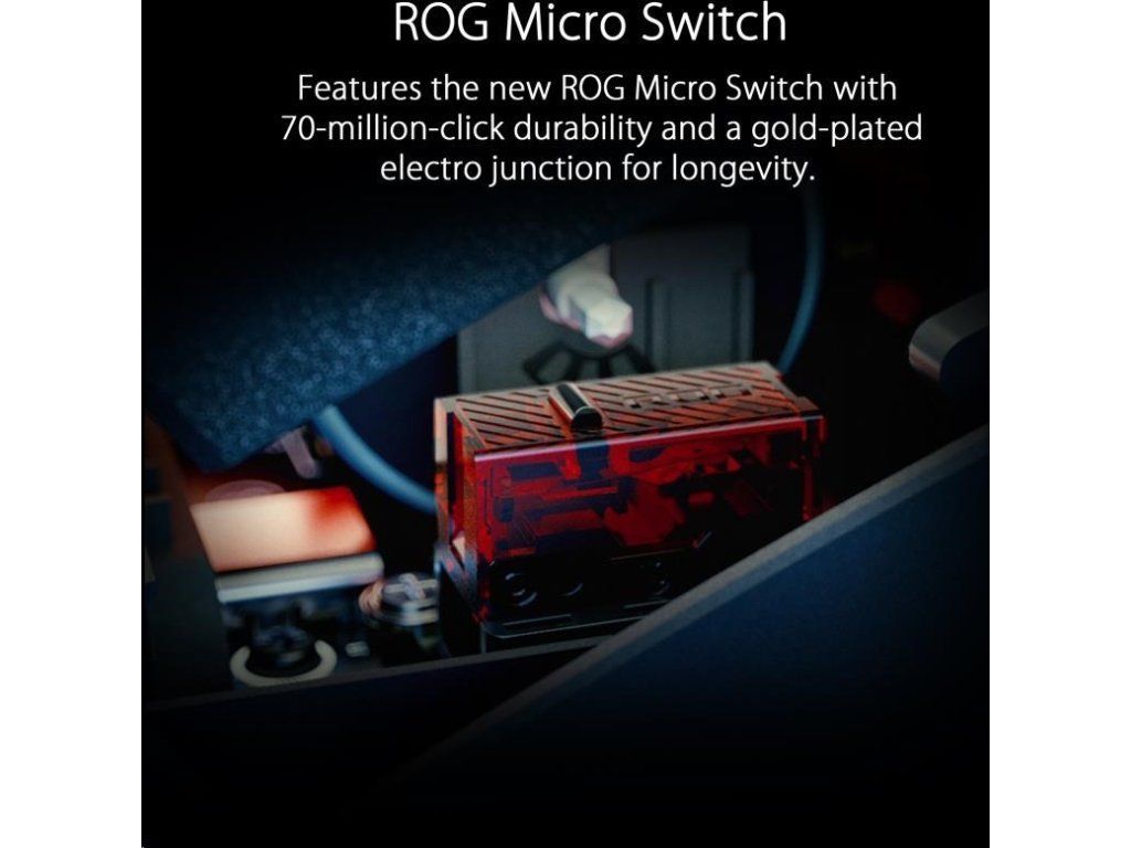 - ROG Micro Switch - ROG Micro Switch je vybavený pozláteným elektrospojom a životnosťou 70 miliónov kliknutí, čo zvyšuje odolnosť a predlžuje životnosť myši. Prísne výrobné štandardy ROG zaručujú, že každé tlačidlo myši si zachováva odchýlku sily v rozmedzí +/- 5 gramov pre konzistentný pocit z kliknutia.