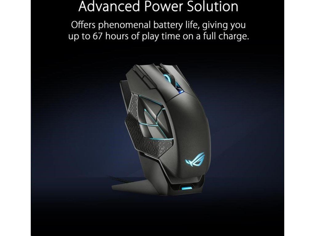 - Pokročilé riešenie napájania - ROG Spatha X ponúka fenomenálnu výdrž batérie, vďaka ktorej môžete na plné nabitie hrať až 67 hodín. A ak sa batéria vybije, stačí 15 minút nabíjania cez USB-C alebo nabíjací dok, aby ste mohli hrať až 12 hodín* intenzívneho bezdrôtového hrania.