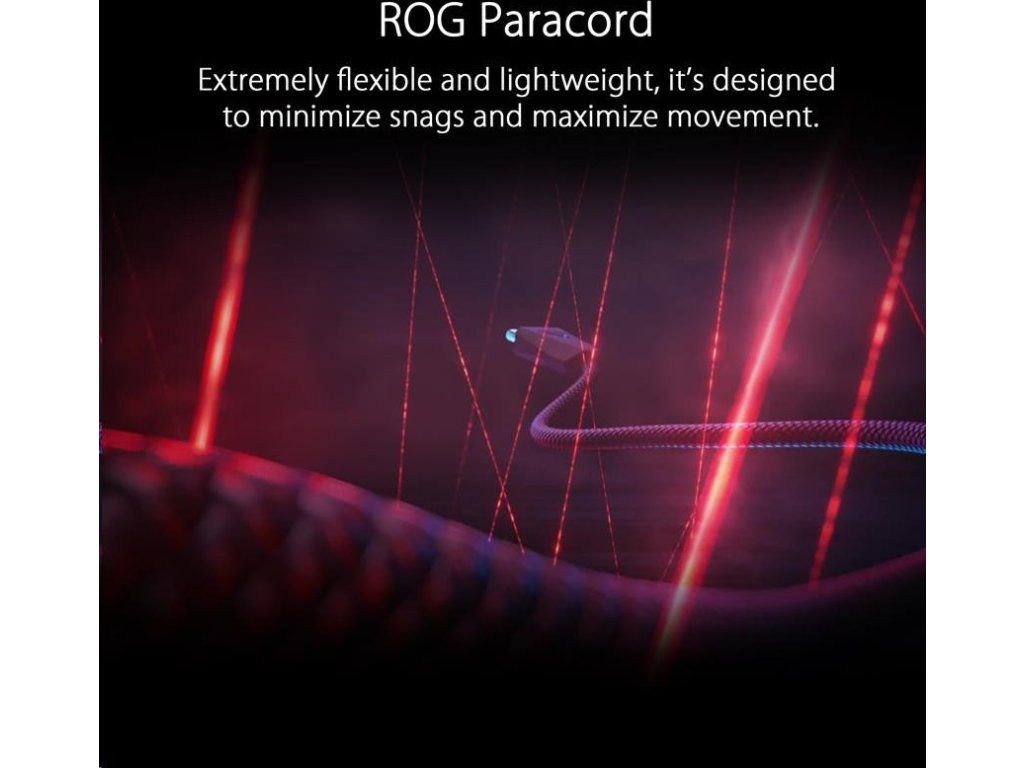 - ROG Paracord - Extrémne flexibilný a ľahký ROG Paracord je navrhnutý tak, aby minimalizoval zasekávanie a maximalizoval pohyb. Vyvýšený port ROG Spatha X poskytuje priestor medzi káblom a povrchom dosky alebo podložky pod myš, čím minimalizuje ťahanie kábla a hluk.