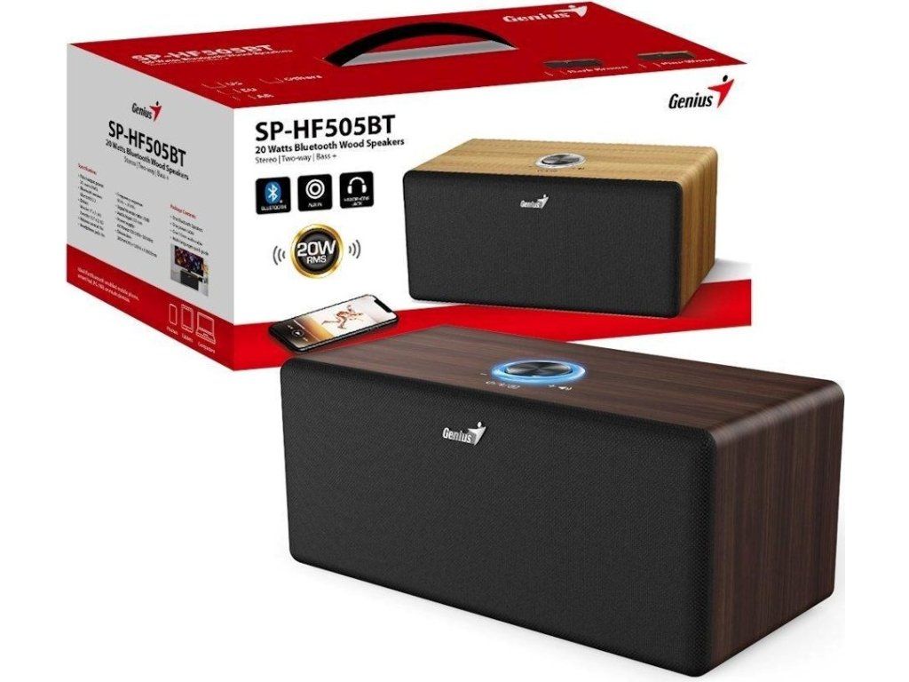 Reproduktor Genius SP-HF505BT sa stane ideálnym základom vášho domáceho ozvučenia. Uplatní sa pri počúvaní hudby, sledovaní filmov, videí alebo hraní hier. Vďaka drevenej konštrukcii je elegantný na pohľad a produkuje prirodzený zvuk bez zkreslenia, ktorý dosahuje celkový výkon 20 W RMS. Bezdrôtová konektivita prostredníctvom technológie Bluetooth vám umožní pohodlné bezdrôtové prepojenie so smartfónom, tabletom alebo notebookom. Samozrejmosťou je tiež prítomnosť AUX vstupu pre pripojenie ďalších zariadení či výstup pre slúchadlá. Na ovládanie slúži jednoduchý gombík umiestnený na hornej strane reproduktora.