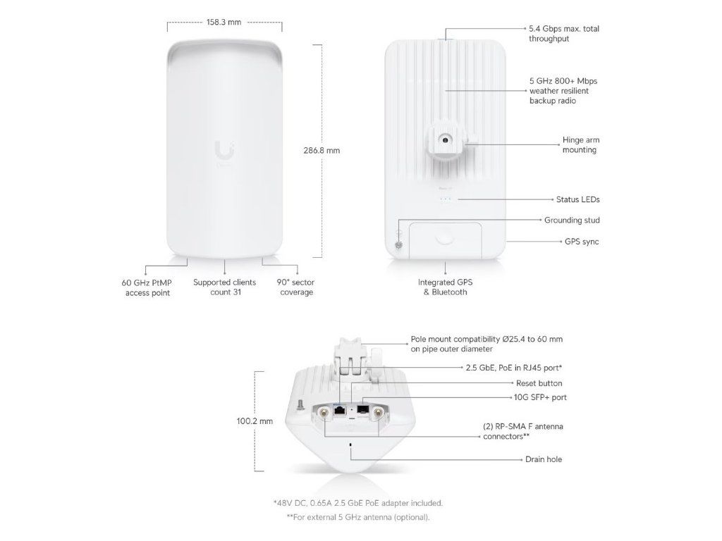 Ubiquiti UISP Wave AP Gen2 je 60GHz PtMP přístupový bod s propustností až 5,4 Gbps (2,7 Gbps duplex), záložním 5GHz rádiem (Wi-Fi 6), 90° sektorovým pokrytím a kapacitou až 24 klientů. Zařízení disponuje 1× 2,5GbE RJ45 a 1× 10G SFP+ portem, integrovanou GPS, Bluetooth rozhraním pro snadné nastavení a podporuje pasivní PoE napájení. Krytí IPX6 zajišťuje odolnost vůči povětrnostním vlivům, provozní teplota je -40 až 60 °C.