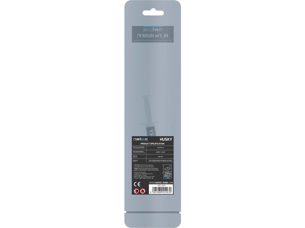 Natec Husky je teplovodivá pasta s vysokou tepelnou vodivostí a nízkým tepelným odporem. Pasta nepřevádí elektrickou energii, nekoroduje a nevyžaduje zahřívání (maximální hodnoty poskytuje ihned po aplikaci).