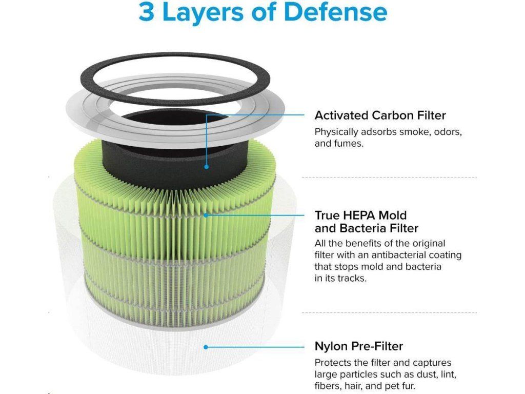 Druhou vrstvou je HEPA filter H13. To odlišuje Levoit od konkurencie, pretože filter HEPA H13 je oveľa kvalitnejšie a spoľahlivejšie ako bežne používané HEPA H11. Tu sa odfiltrujú jemné prachové častice, pleseň, baktérie, peľ, dymové častice, roztoče a srsť.