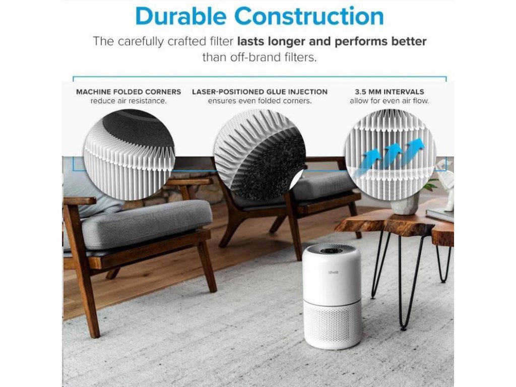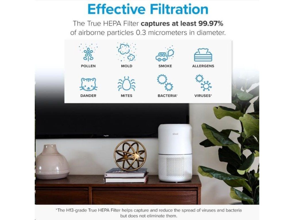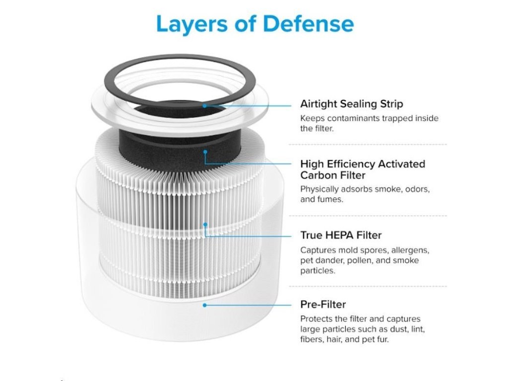 Druhou vrstvou je HEPA filter H13. To odlišuje Levoit od konkurencie, pretože filter HEPA H13 je oveľa kvalitnejší a spoľahlivejší ako bežne používané HEPA H11. Tu sa odfiltrujú jemné prachové častice, pleseň, baktérie, peľ, dymové častice, roztoče a srsť.