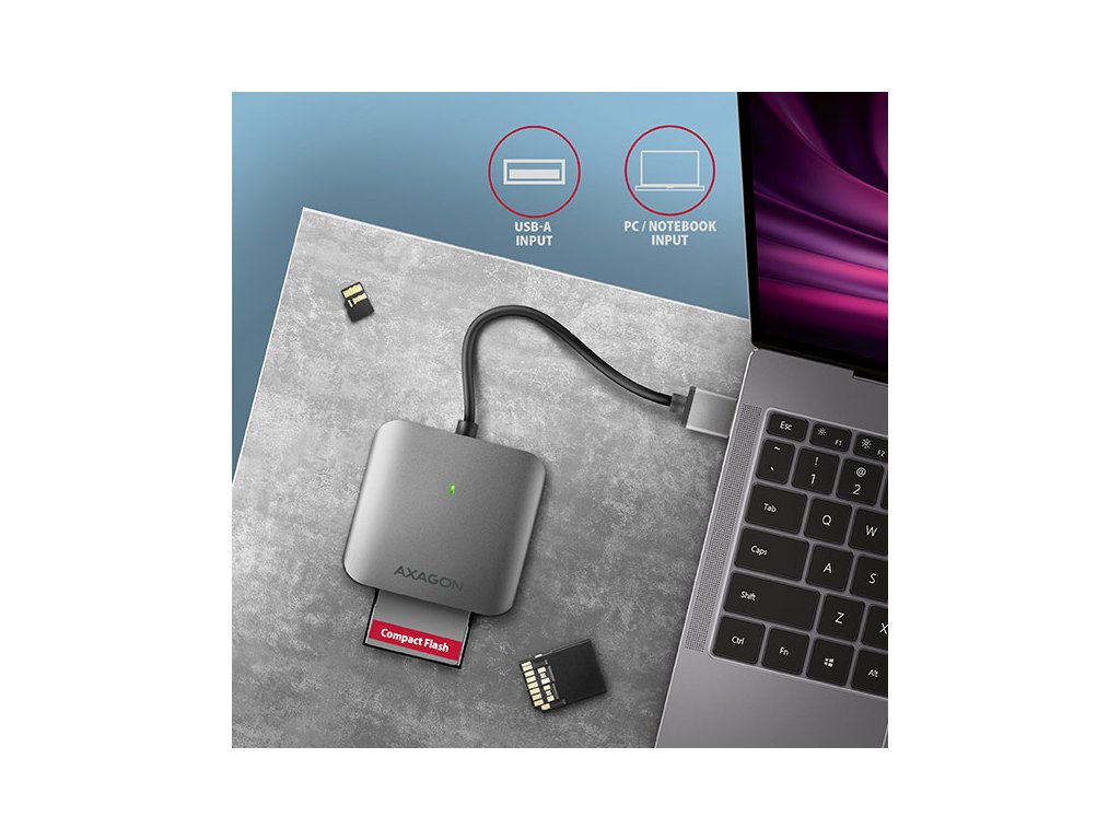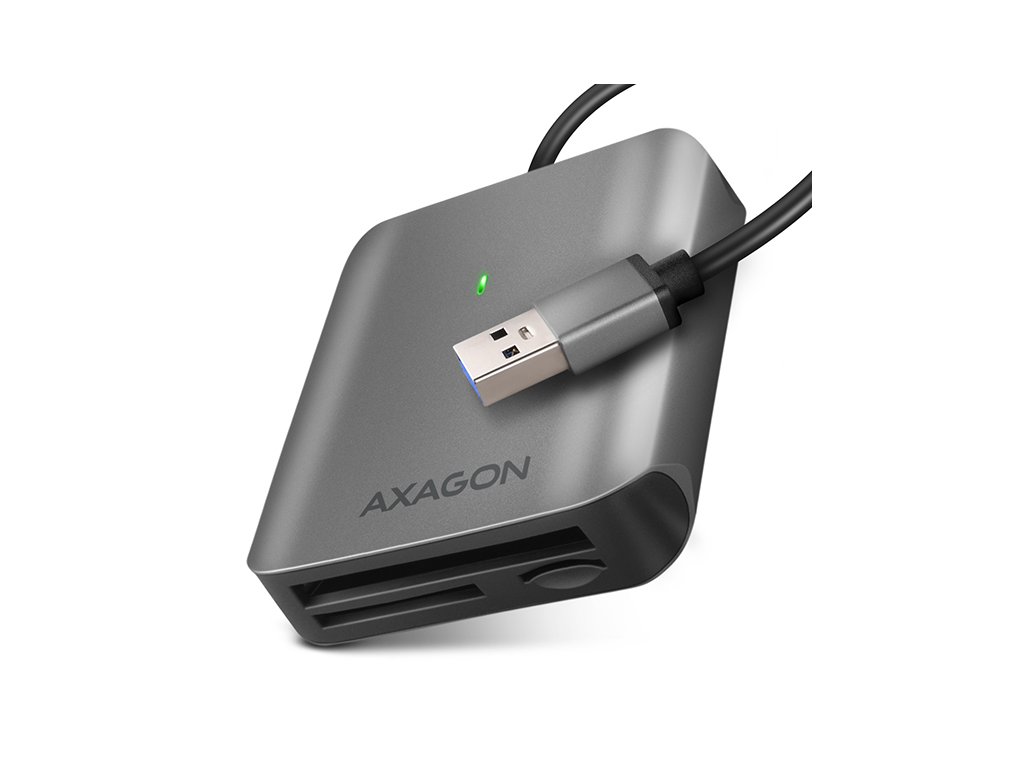 Hliníková čítačka pamäťových kariet AXAGON CRE-S3 SUPERSPEED 3v1 s rozhraním USB 3.2 Gen 1 podporuje všetky aktuálne verzie SD a microSD kariet vrátane SDXC a microSDXC s kapacitou až 2TB. Podporuje tiež CF karty s kapacitou až 128PT.