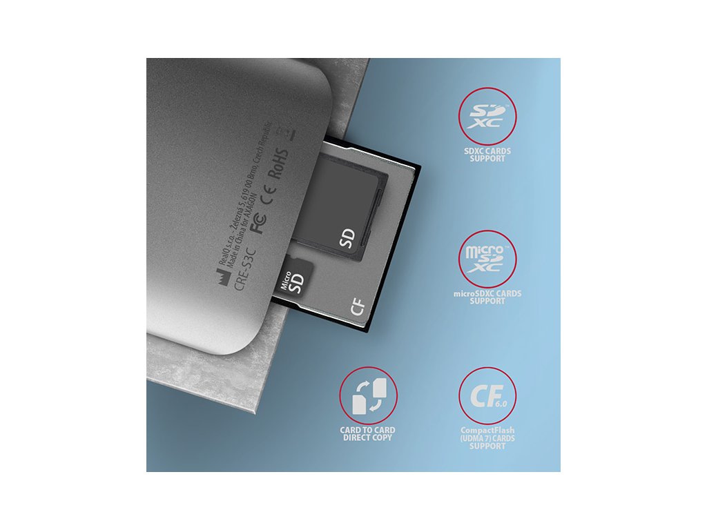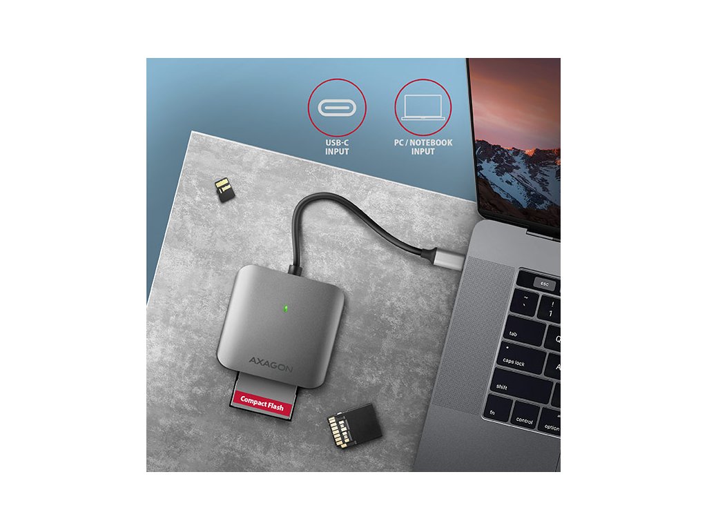 Hliníková čítačka pamäťových kariet AXAGON CRE-S3C SUPERSPEED 3v1 s rozhraním USB 3.2 Gen 1 podporuje všetky aktuálne verzie SD a microSD kariet vrátane SDXC a microSDXC s kapacitou až 2TB. Podporuje tiež CF karty s kapacitou až 128PT. Vďaka modernému obojstrannému USB-C konektoru čítačku ľahko pripojíte k notebooku, telefónu alebo počítaču s USB-C konektorom.