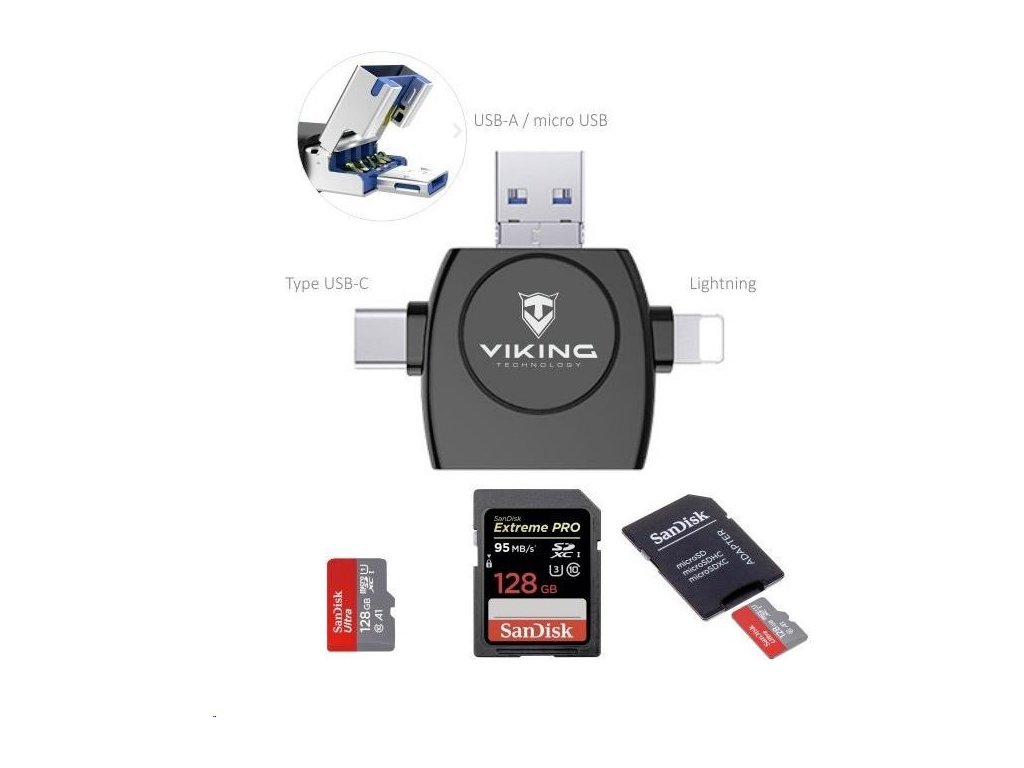 ČÍTAČKA PAMÄŤOVÝCH KARIET VIKING V4 USD3.0 4v1 s APPLE LIGHTNING/MICRO USB/USB/USB-C