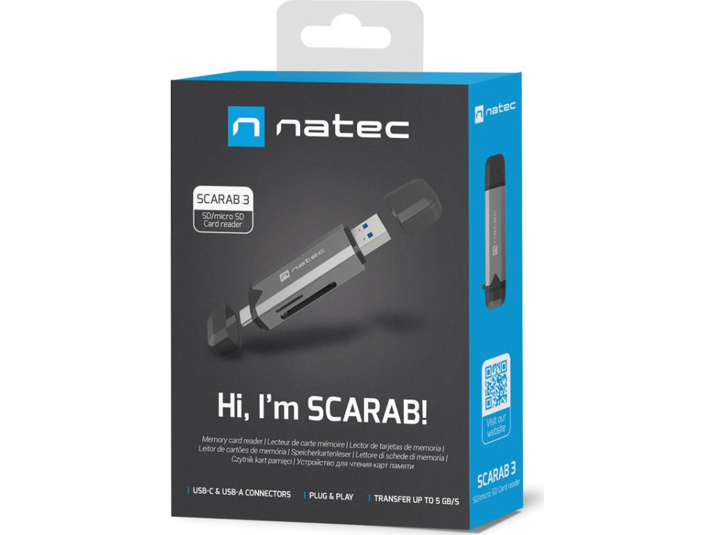 Kompaktní a funkční, Natec Scarab 3 - paměťová čtečka, kterou si můžete snadno vzít kamkoli s sebou. Za svou funkčnost vděčí nejen konektorům USB typu A a C, ale také schopnosti prohlížet obsah zařízení s podporou OTG, a to není vše.