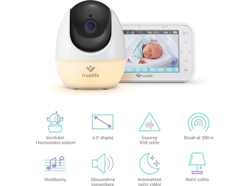 Príchod dieťaťa na svet je nezabudnuteľný okamih a je prirodzené, že rodičia chcú byť pri každom úsmeve, pohybe a pokojnom spánku. Sú však chvíle, keď s bábätkom nemôžu byť, a vtedy prichádza na rad spoľahlivý partner, 360° otočná detská pestúnka TrueLife NannyCam R4 Pro. Vďaka nej máte dieťa na dosah na 4,3" LCD IPS displeji, nech ste kdekoľvek, a to až zo vzdialenosti 300 metrov. Takže môžete bez obáv bežať pre kuriéra alebo vešať bielizeň do sušičky, zatiaľ čo váš malý poklad spí. Hneď ako sa zotmie, automaticky sa aktivuje nočné videnie, takže môžete svoje dieťa sledovať v perfektnej kvalite aj počas noci. Batéria vydrží až 10 hodín, pričom pri zapnutom režime VOX až 17 hodín. V tomto prípade sa displej aktivuje len vtedy, keď detská pestúnka zaznamená zvuk. Ak sa vaše dieťa prebudí, môžete ho vďaka obojsmernej komunikácii upokojiť svojím hlasom skôr, ako sa k nemu dostanete. K dispozícii je aj 8 upokojujúcich uspávaniek, ktoré pomáhajú vytvoriť pocit bezpečia. Praktické funkcie, ako je detekcia izbovej teploty a pripomenutie kŕmenia, uľahčujú každodennú starostlivosť, a to aj pri podávaní liekov počas choroby. A pretože deti nerady zaspávajú v tme, ponúka detská pestúnka aj príjemné nočné osvetlenie. Pre ešte väčšie pohodlie môžete k rodičovskej jednotke pripojiť ďalšiu kameru a monitorovať viac miestností naraz. Kamera TrueLife NannyCam R4 Pro je nielen detská pestúnka, ale aj váš neúnavný asistent, ktorý vám pomôže nájsť rovnováhu medzi starostlivosťou o dieťa a všetkým ostatným, čo k rodičovstvu patrí.