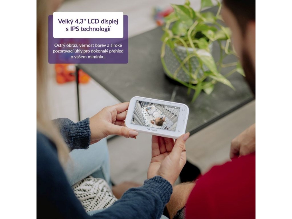 Rodičovská jednotka je vybavená 4,3" LCD IPS displejom. IPS technológia nielen vylepšuje vernosť farieb, ale tiež poskytuje širšie pozorovacie uhly.