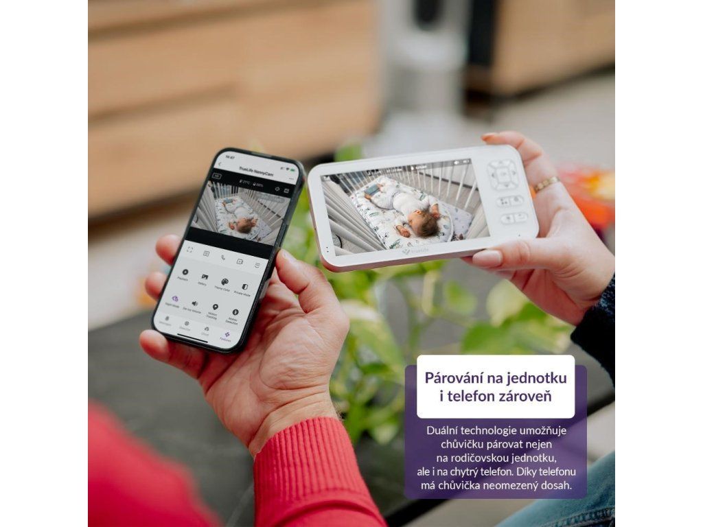 Vďaka duálnej technológii môžete mať svoje bábätko na dosah nielen cez rodičovskú jednotku, ale aj priamo vo svojom smartfóne.