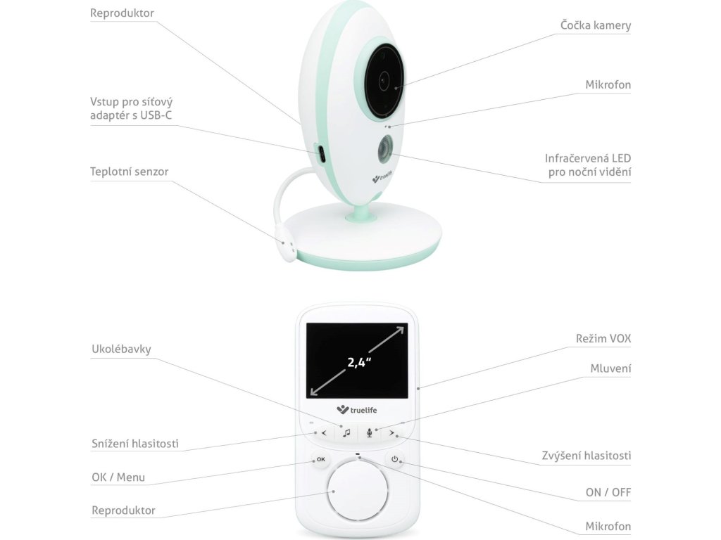 Obľúbená pestúnka, overená zákazníkmi, TrueLife NannyCam V24 vo vylepšenej verzii je tu. TrueLife NannyCam V24 Pro je digitálna video opatrovateľka s prehľadným farebným 2,4 palcovým LCD displejom, izbovým teplomerom, automatickým nočným módom a moderným USB-C pripojením pre rýchle a spoľahlivé nabíjanie. Prenos zvuku aj obrazu je vysoko kvalitný vo dne aj v noci. Môžete byť v pokoji a mať istotu, že je s Vašimi blízkymi všetko v poriadku, pretože použitá digitálna technológia s frekvenciou 2.4 GHz zaručuje bezpečný a stabilný signál.