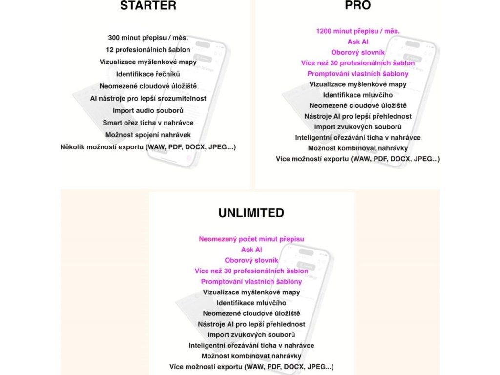 Pre prepis, sumarizáciu a ďalšie funkcie záznamníka Plaud je dostupná služba Plaud AI membership. Ak vám stačí 300 a menej, môžete pokračovať s plánom Starter, ktorý je zadarmo a ponúka prakticky všetky funkcie. Ak potrebujete viac, je pre vás plán Pro s 1200 minútami prepisu a prístupom k experimentálnym funkciám, ako je identifikácia rečníka alebo prekladač, ktoré sa budú priebežne objavovať v aplikácii. Obe plány ponúknu 10 000 minút cloudového úložiska a AI potlačenia šumu.