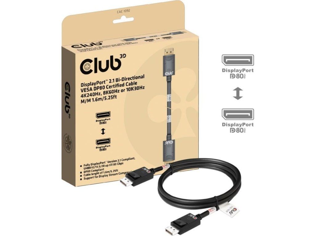 Club3D Kabel DisplayPort 2.1 na DisplayPort 2.1, VESA DP80, 4K240Hz/8K60Hz/10K60Hz (M/M), 1.6m, černá