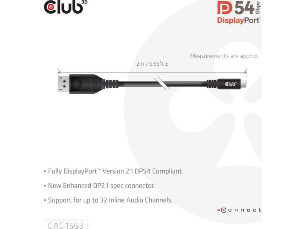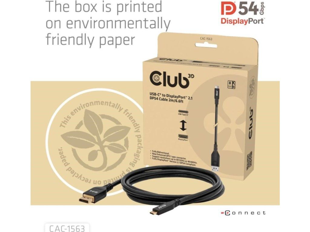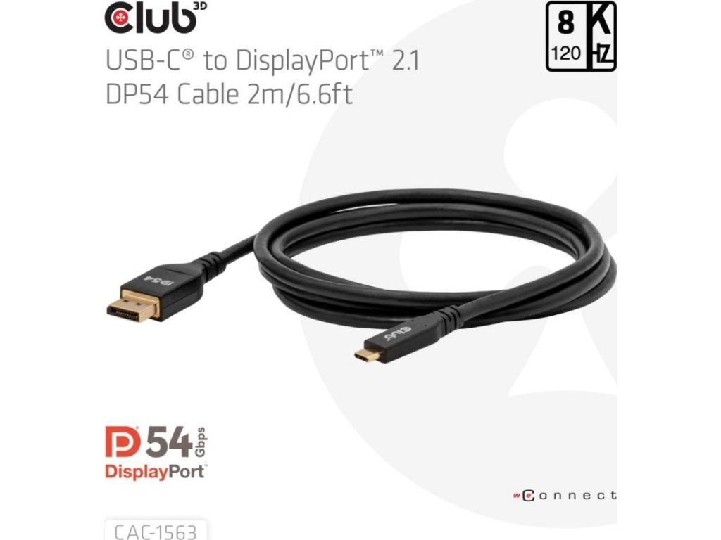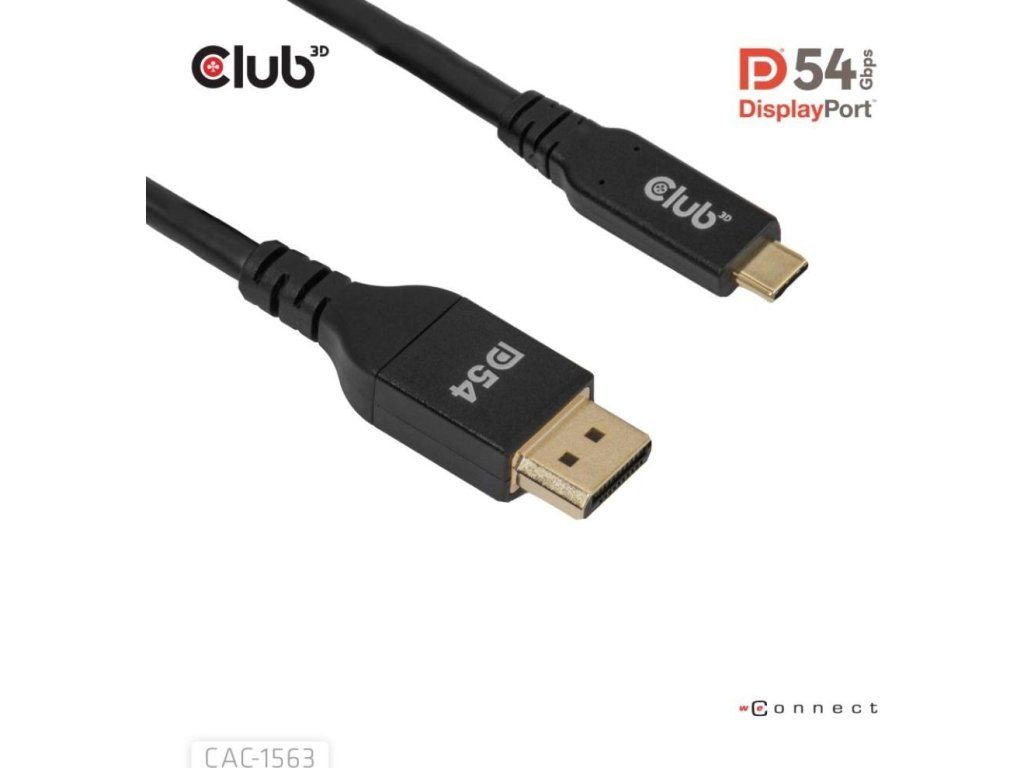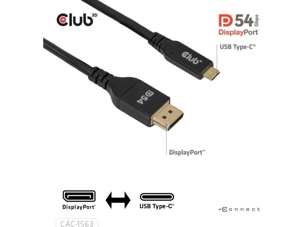 Club 3D CAC-1563 USB-C na DisplayPort 2.1 DP54 kábel umožňuje pripojiť váš USB-C notebook k monitoru s rozhraním DisplayPort. Kábel možno tiež použiť opačne – pomocou DisplayPort výstupu na vašej grafickej karte môžete pripojiť monitor s USB-C vstupom.