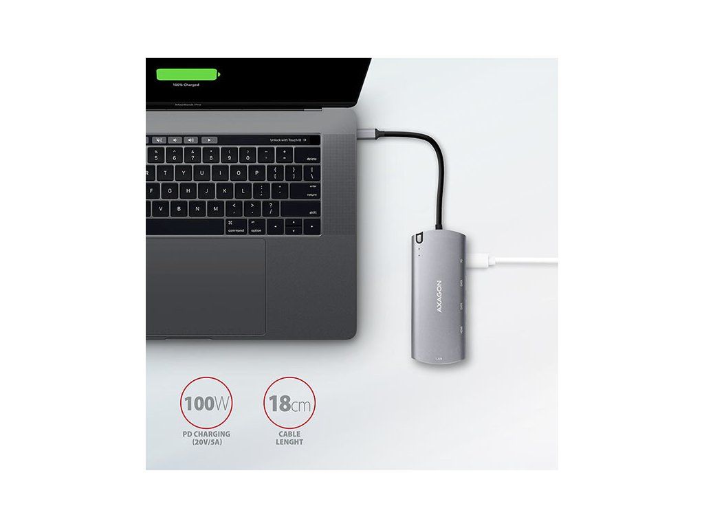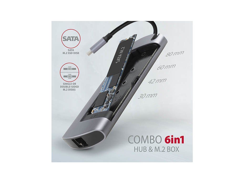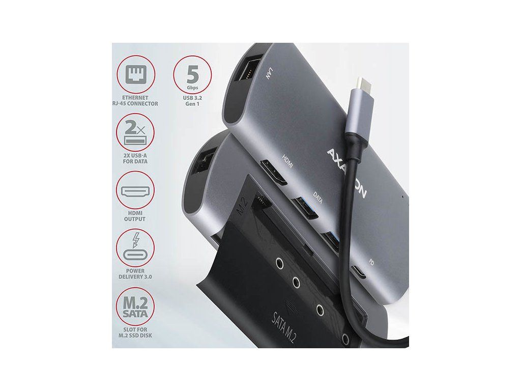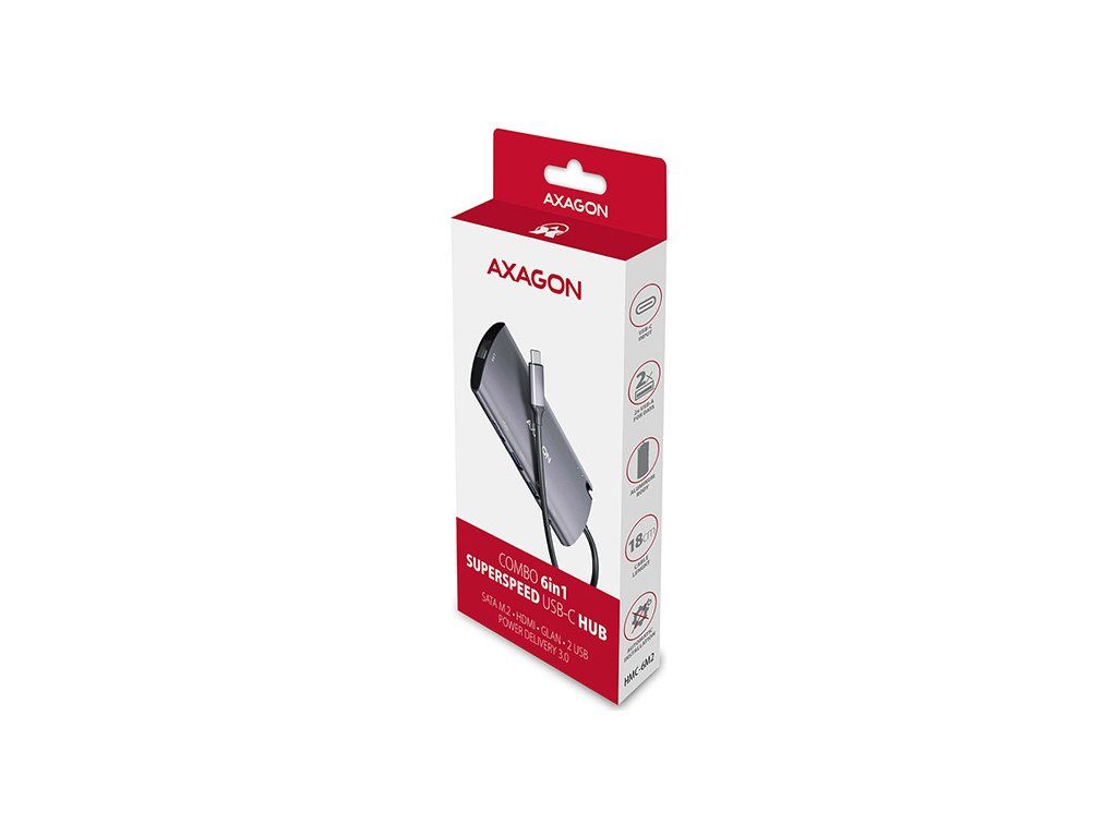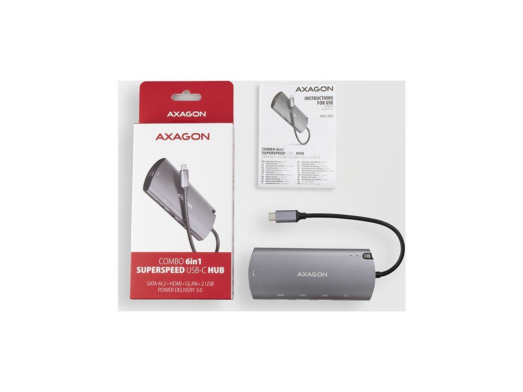 Viacportové USB-C 3.rozbočovač AXAGON HMC-6M2 COMBO 6v1 2 Gen 1 rozšíri váš notebook, počítač alebo telefón o štyri porty a externý box pre M.2 pohon. Ľahko a rýchlo pripojte dve zariadenia USB, gigabitovú sieť Ethernet, displej HDMI a SATA Mk počítaču prostredníctvom obojstranného konektora USB-C.2 jednotky SSD súčasne. Zároveň máte možnosť napájať notebook pomocou technológie Power Delivery. Rozbočovač USB-C vám poskytne jednoduchú a kompaktnú dokovaciu stanicu 6 v 1 pre notebook, napríklad MacBook Pro.